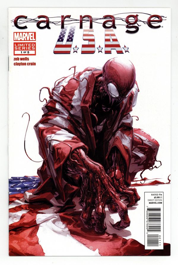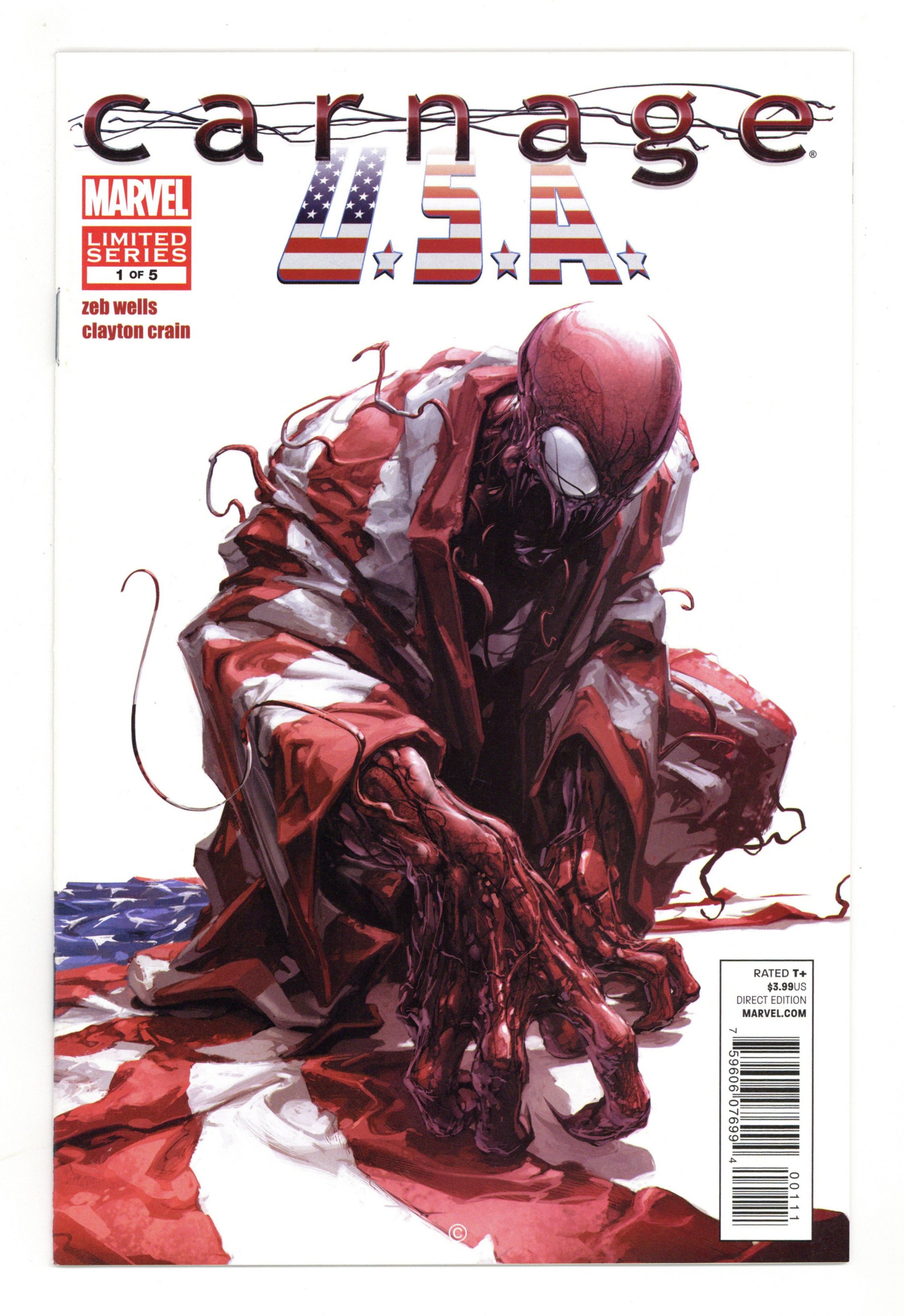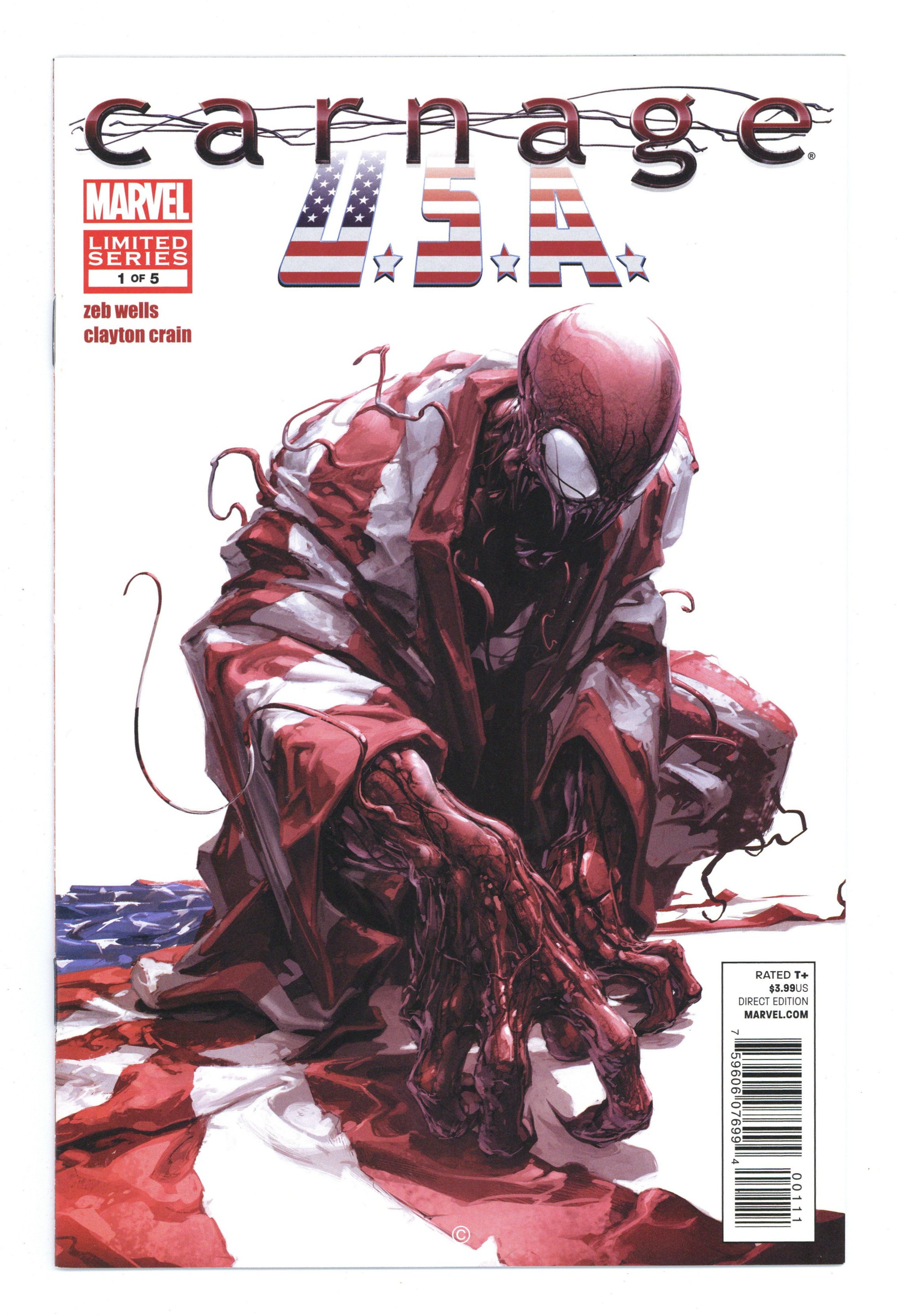 Cover by Clayton Crain WELCOME TO CARNAGE U.S.A. - THE ULTIMATE RED STATE! Carnage's maniacal reign of terror continues, courtesy of the critically acclaimed creative team of Zeb Wells and Clayton Crain! Spider-Man and the Avengers must go on a brutal hunt to capture Cletus Kasaday before a small town in the American heartland falls under his mass-murdering spell! Buckle in and prepare for a violence packed adventure! Carnage U.S.A. wants YOU! Cover price $3.99.