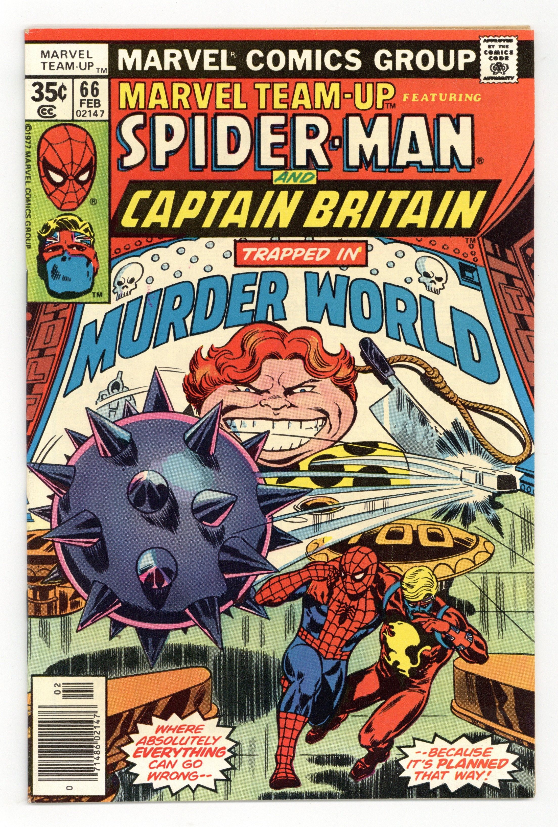 Pizzazz Variant, has centerfold subscription offer for "Pizzazz" Magazine. "Murder World" Part 2 of 2. Guest-starring Spider-Man and Captain Britain. Script by Chris Claremont. Pencils by John Byrne. Inks by Dave Hunt. Cover by John Byrne and Frank Giacoia. Captain Britain and the Spectacular Spider-Man wake up inside a giant pinball machine! The two heroes are trapped in Murderworld...an amusement park for murder! Can the web-slinger and Captain Britain beat Arcade at his own game? And also save Courtney Ross in the process? First appearance of Murderworld. Cameo appearance by Captain Jean DeWolff. (Notes: Arcade appears next in Uncanny X-Men 122. This two-part story was reprinted in Marvel Tales 201 and 202.) 32 pages Cover price $0.35.