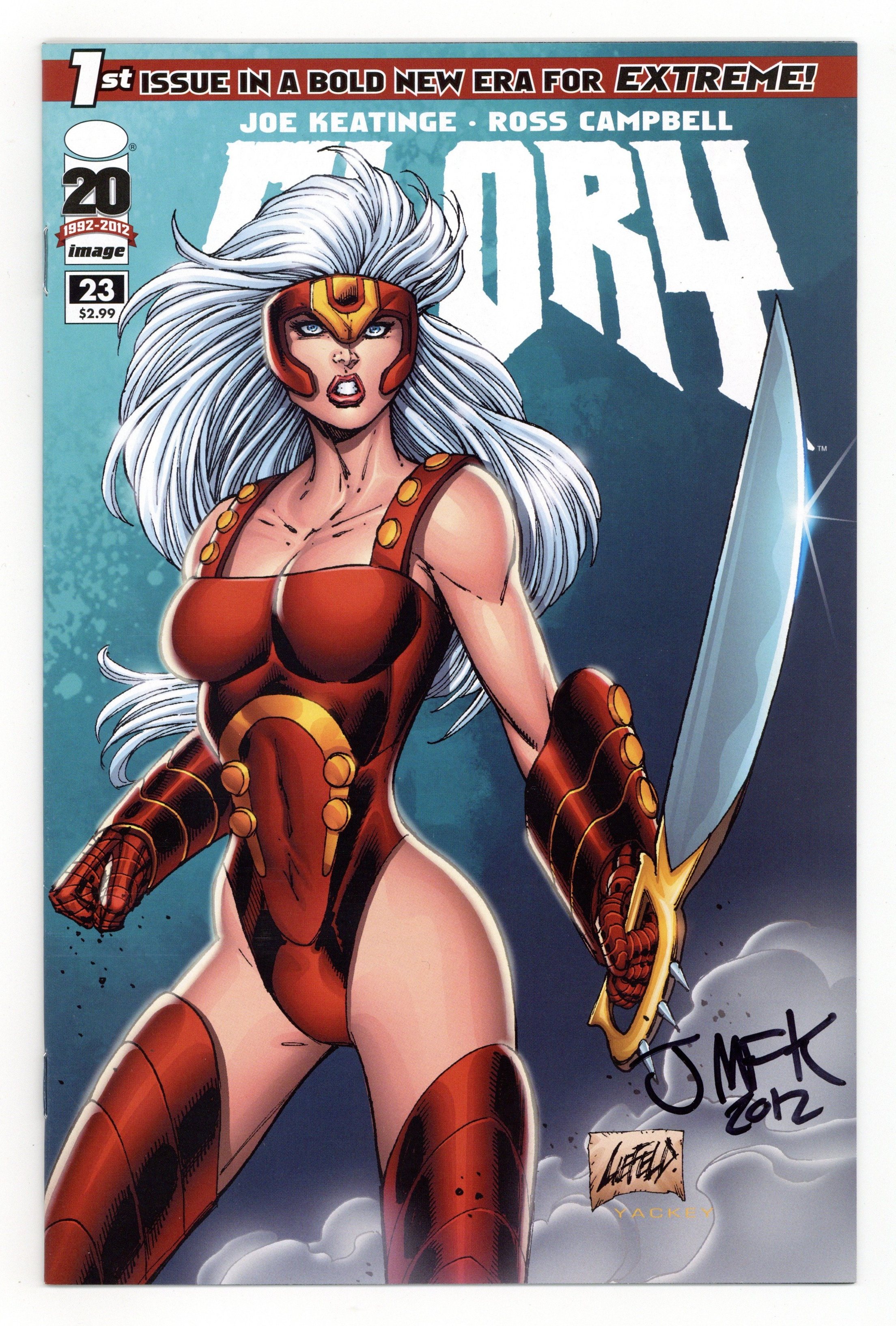 Cover by Rob Liefeld Once and Future: Part 1 - story JOE KEATINGE art ROSS CAMPBELL 'ONCE AND FUTURE,' Part One EXTREME'S ORIGINAL WARRIOR GODDESS RETURNS! After missing for almost a decade, Glory's whereabouts are uncovered by a lone reporter, but the globe-spanning conspiracy keeping her hidden from humanity could make her return more dangerous than anyone ever anticipated! This first issue of an brand-new saga written by Eisner & Harvey-award winner JOE KEATINGE and illustrated by Wet Moon and Shadoweyes creator ROSS CAMPBELL sets up Glory's future by expanding on her past in a way promising to shock long-time fans and excite all-new readers! Cover price $2.99.