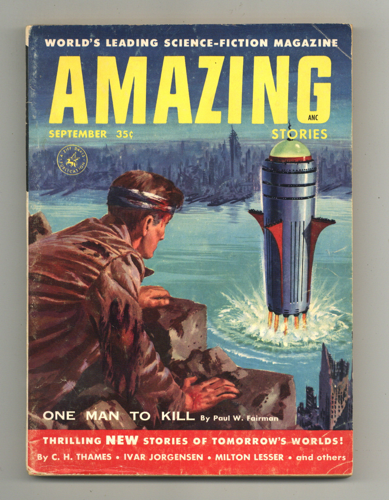 Published Sep 1955 by Experimenter Publications.$14.00Sept 1955. Science fiction stories by Paul W. Fairman, Milton Lesser, C.H. Thomes, and Ivar Jorgensen. Cover by Edward Valigursky. 5-1/2 in. x 7-1/2 in.; black and white; 130 newsprint pages. Cover price $0.35.