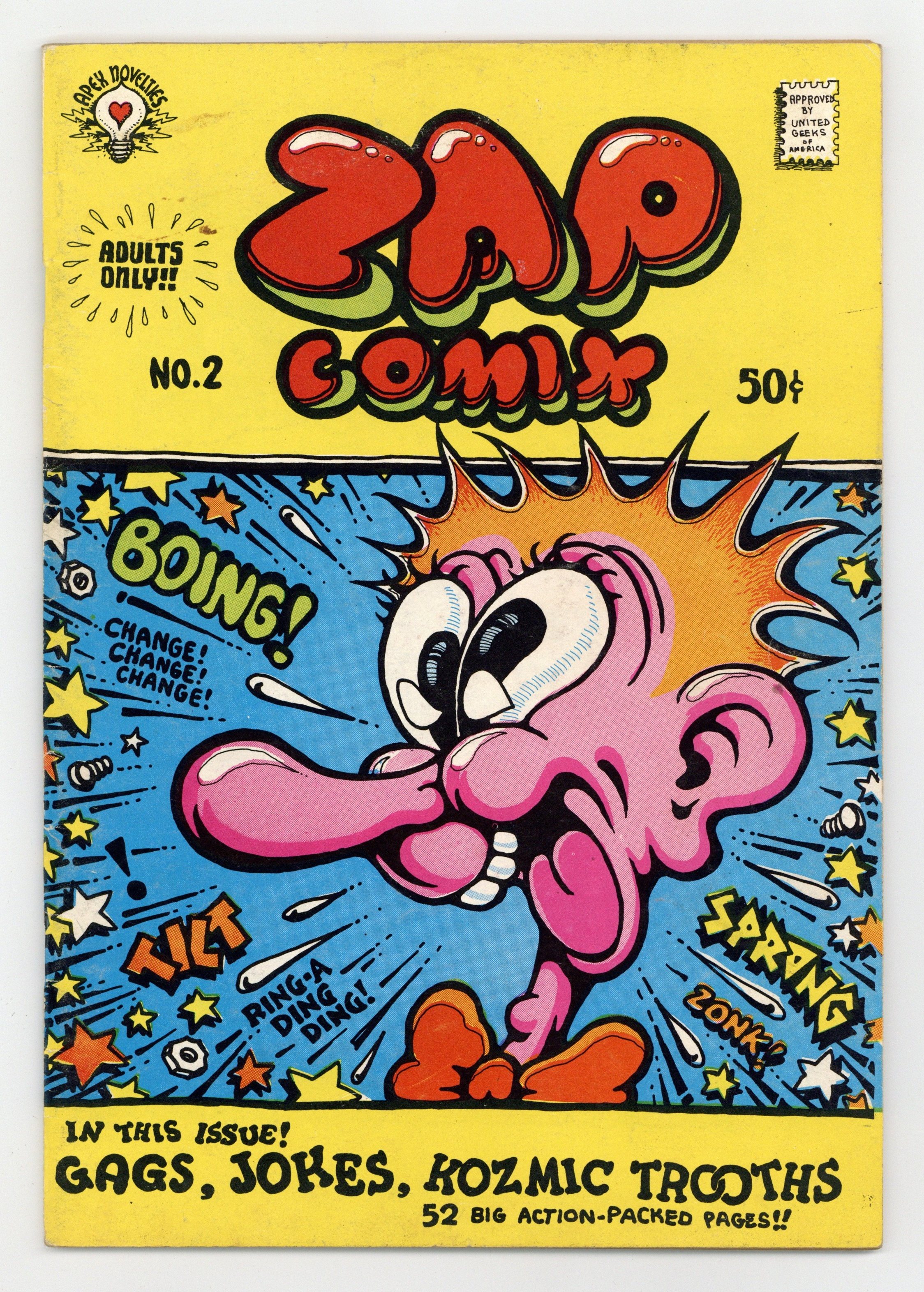 Tags: UndergroundPublished 1968 by Apex Novelties.$16.002nd printing. Robert Crumb cover, story and art. S. Clay Wilson, Rick Griffin and Victor Moscoso story and art. Mr. Natural and Checkered Demon stories. 1st Wilson, Griffin and Moscoso story and art in Zap. MATURE READERS. Cover price $0.50.