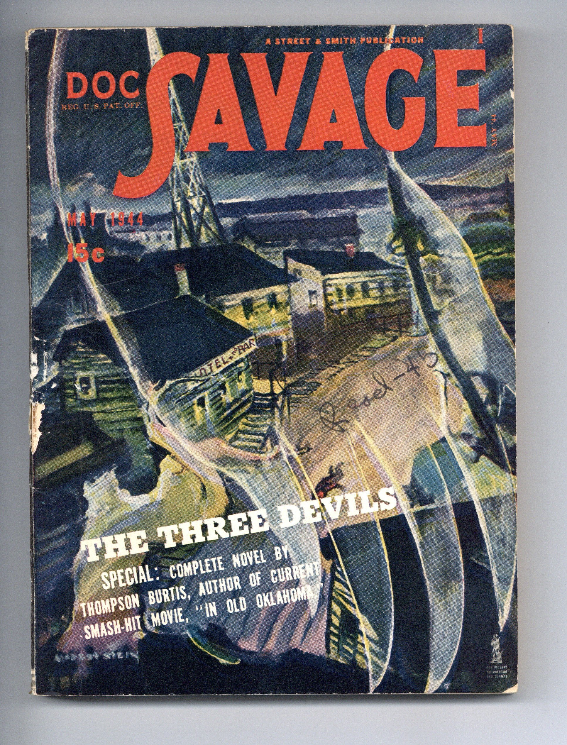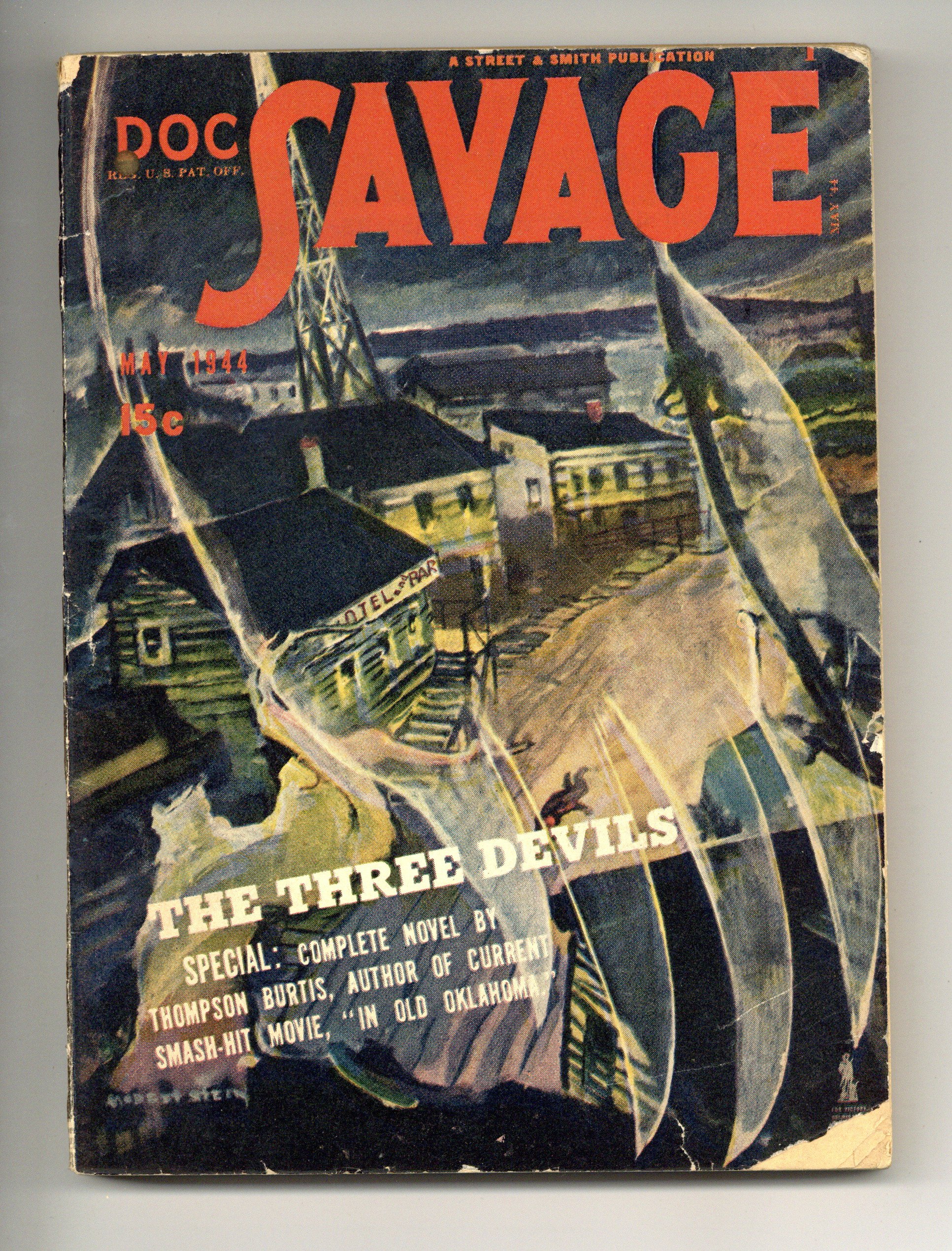 May 1944. Cover by Modest Stein. Stories include "The Three Devils," a book-length novel by "Kenneth Robeson"; "Special Performance" by Thomson Burtis; and "Scarlet Justice" by Robert C. Blackmon. 5.5-in x 7.75-in.; black and white; 128 newsprint pages. Cover price $0.15.