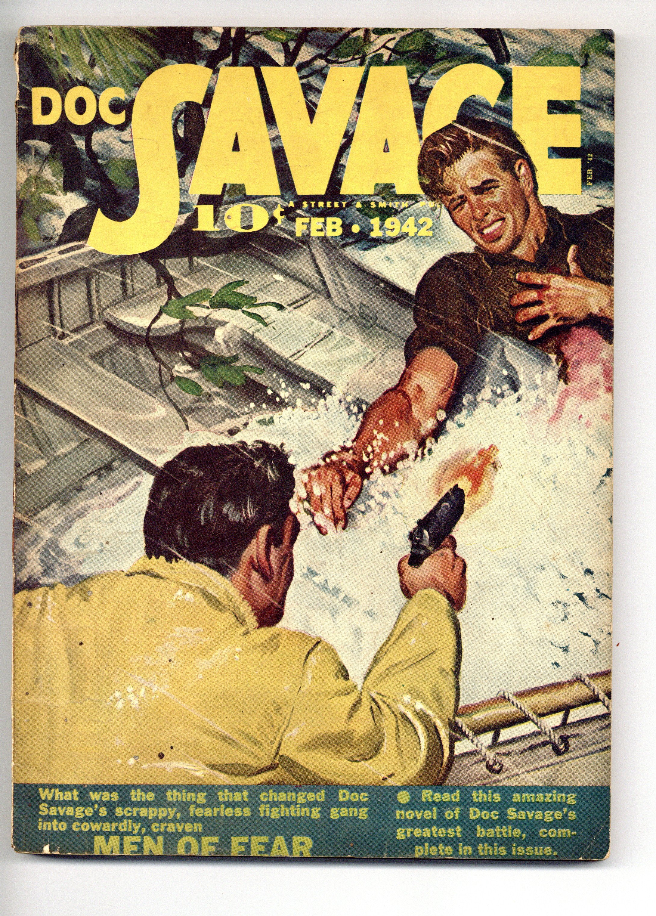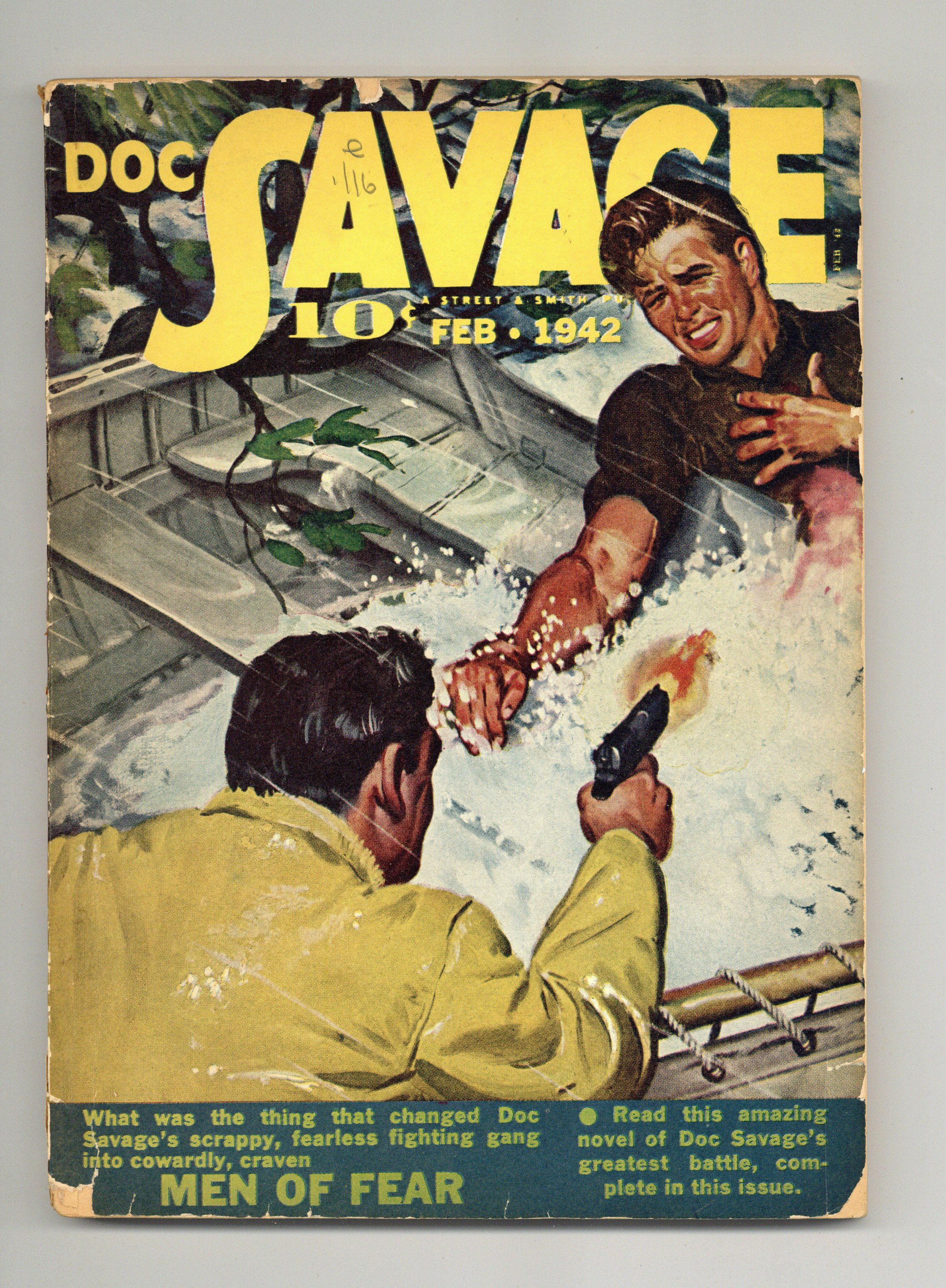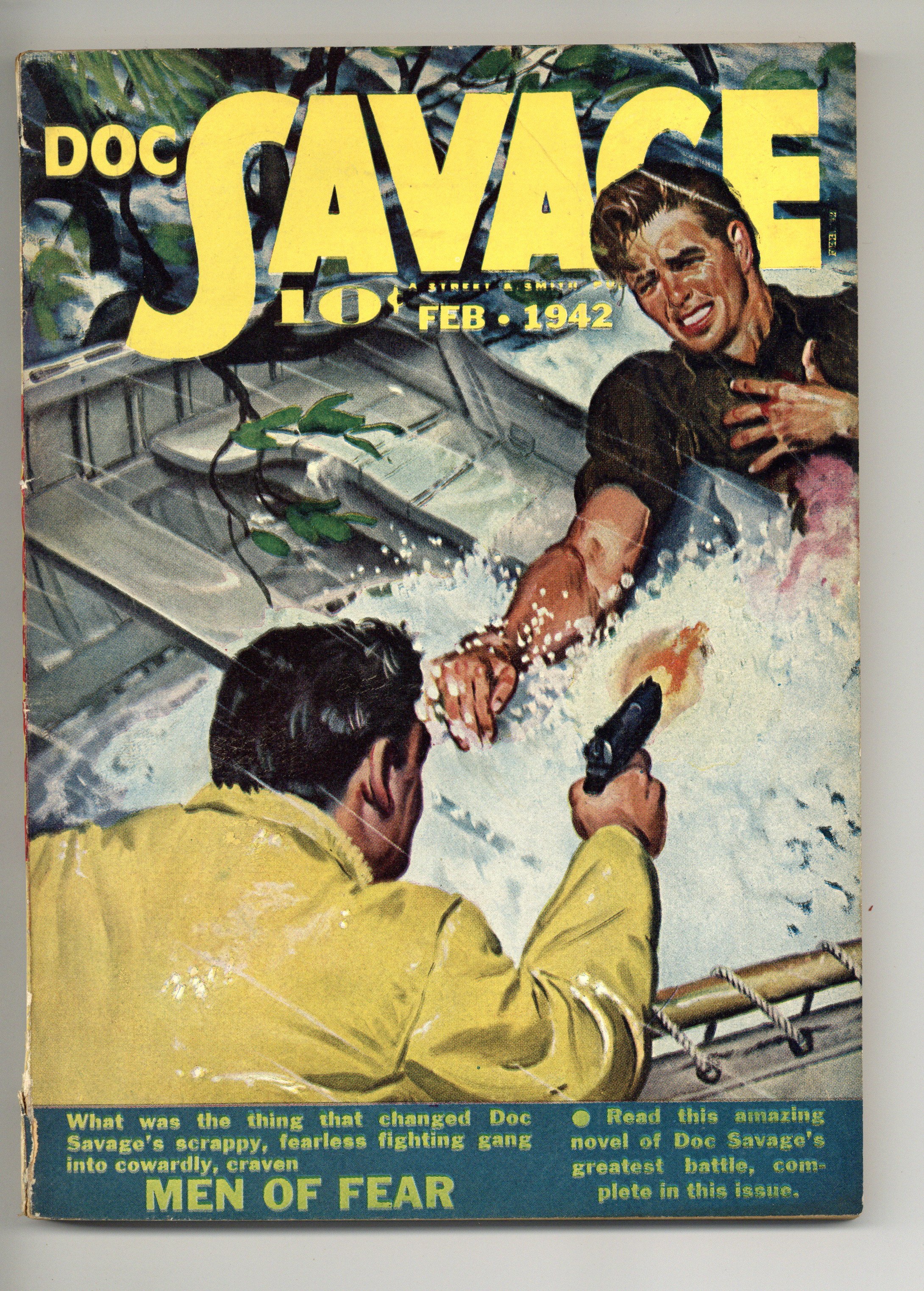 Volume 18, Issue 6 - February, 1942. Cover by Emery Clarke. Stories include "Men of Fear," a book-length novel by "Kenneth Robeson," and "Secret Cargo" by Wallace Brooker. 6.75-in x 9.25-in; black and white; 112 newsprint pages. Cover price $0.10.