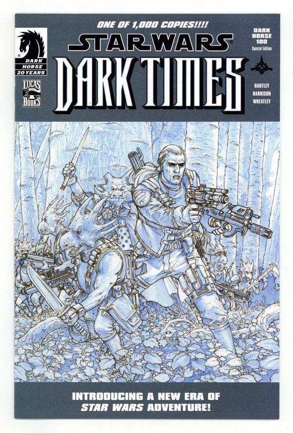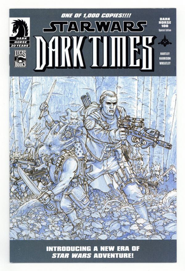 Tags: Star WarsPublished Oct 2006 by Dark Horse.$100.00Dark Horse 100 Special Edition. Limited to 1000 copies. For over a thousand generations the Jedi Knights were the guardians of peace and justice in the Old Republic. Before the dark times, before the Empire.' -Ben Kenobi The dark times are here. Even as the worlds of the former Republic are drawn into the iron grip of Palpatine's Empire, the galaxy seems adrift in a sea of chaos, lawlessness, and despair. On Coruscant, Darth Vader waits for his Master to reveal his vision for the future. But is there a plan beyond obtaining power? On New Plympto, Jedi Master Dass Jennir leads a Nosaurian army in a war they have already lost. Is this what it now means to be a Jedi? Dark Times #1 is the gateway to a new era in Star Wars history, an era where the future is grim, evil is on the rise, and all paths seem to lead nowhere . . . ? Moving into the new, unexplored territory of the time period immediately following Revenge of the Sith. ? References the events in the Del Rey novel Dark Lord.