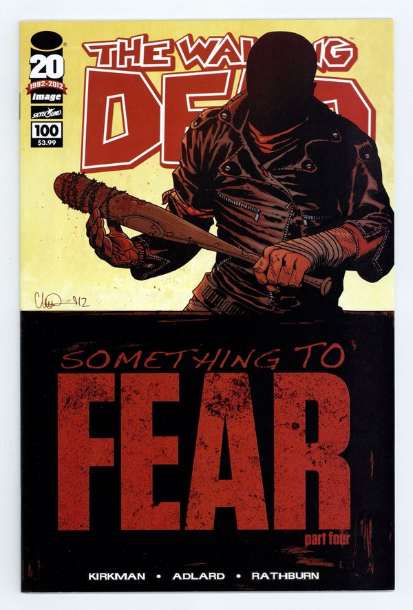 $15.00Cover by Charlie Adlard. First appearance of Negan & "Lucille", Death of Glenn. Something to Fear: Part 4 of 6 - (W) Robert Kirkman (A) Charlie Adlard, Cliff Rathburn 'SOMETHING TO FEAR' CONTINUES! This extra-sized chapter contains one of the darkest moments in Rick Grimes' life, and one of the most violent and brutal things to happen within the pages of this series. 100 issues later, this series remains just as relentless as the debut issue. Do not miss the monumental 100th issue of THE WALKING DEAD! NOTE: 1st Appearance of of Negan & Lucille. Cover price $3.99.