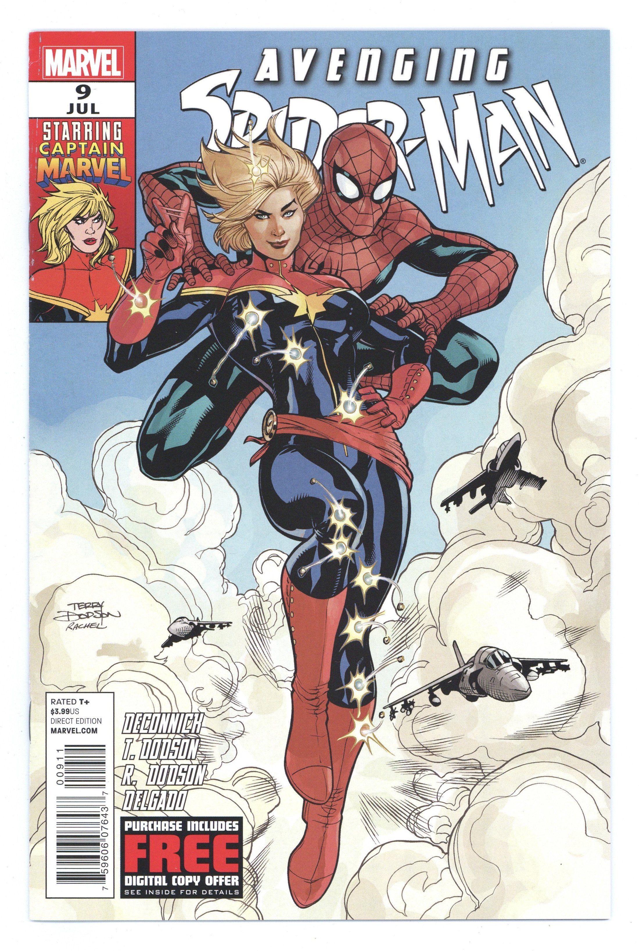 Starts Feb 2 (W) Kelly Sue DeConnick. (A/CA) Terry Dodson, Rachel Dodson Spider-Man plummets into action with the star of this month's hottest new comic: the all new CAPTAIN MARVEL! 50,000 feet up and only on one of them can fly ... Is the World's Greatest Super Hero Ready for a ride with Earth's Mightiest Hero? Cover price $3.99.