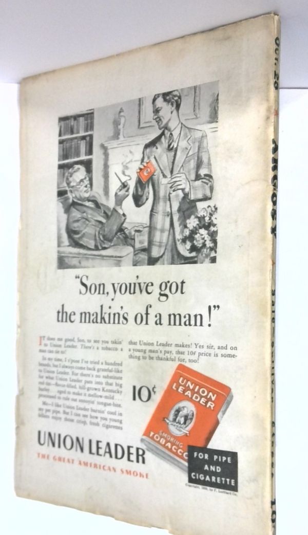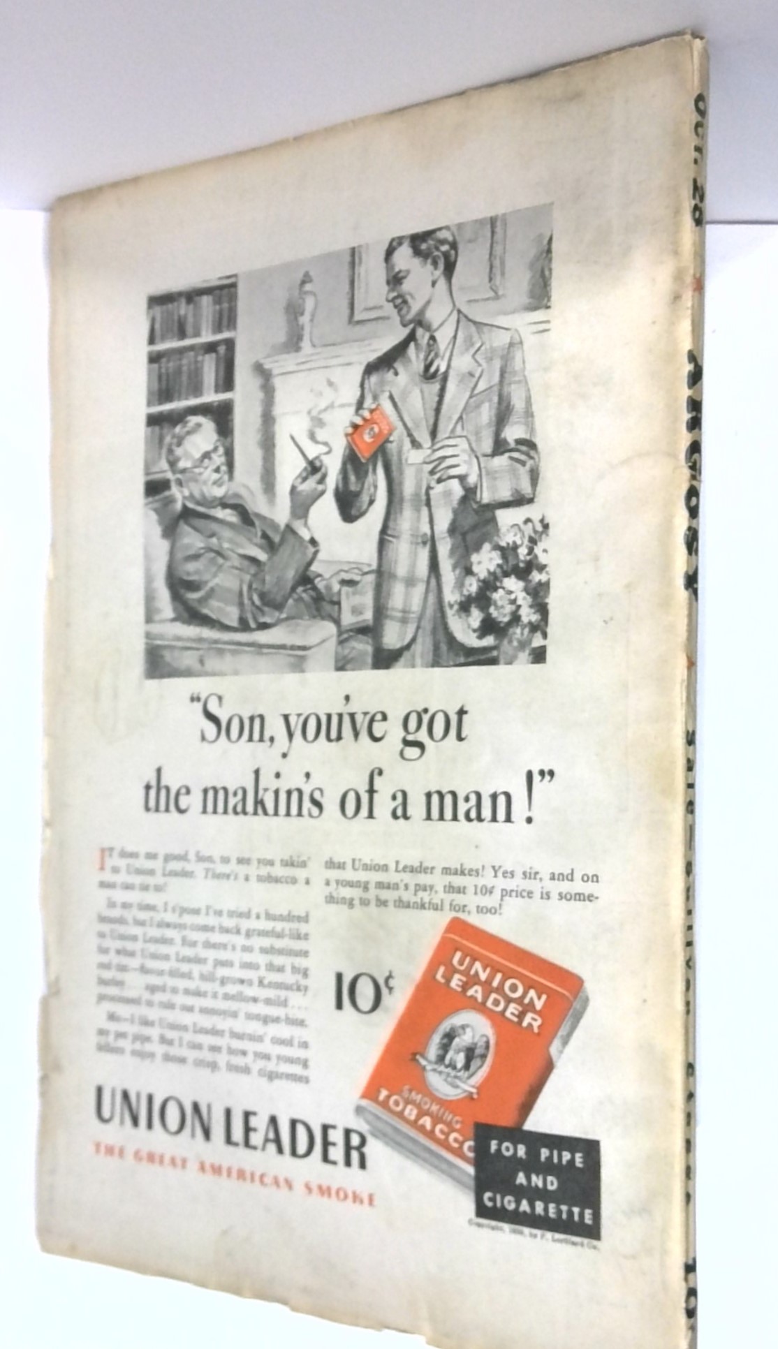 Volume 294, Issue 3 - October, 28, 1939. Cover by Rudolph Belarski. Stories include "Lords of Creation" (conclusion) by Eando Binder, "The Devil's Diary" (part 5) by William De Bois, "The Stars Spell Death" (part 1) by Jonathan Stagge, "Captain Jonah" by Crawford Sullivan, "The Temple Cats" by Jay Clark, "The Lonely World" by Richard Sale, "Brother Cowpoke" by Arthur Lawson, "Farewell Trumpet" by Charles L. Clifford, "Boom Goes the Weasel" by Robert Neal Leath, and "Men of Daring" by Stookie Allen. 7-in. x 10-in.; black and white; 130 newsprint pages. Cover price $0.10.