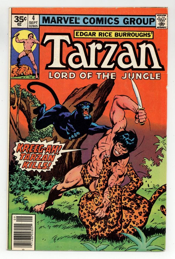 35 cent price cover variant, with square price style. "A Beast Again." Arab slaver Achmet Zek and his henchmen burn down Tarzan's estate and make off with Jane. Albert Werper steals Tarzan's jewels of Opar. Script by Roy Thomas, art by John Buscema, cover by Tony DeZuniga. Cover price $0.35.