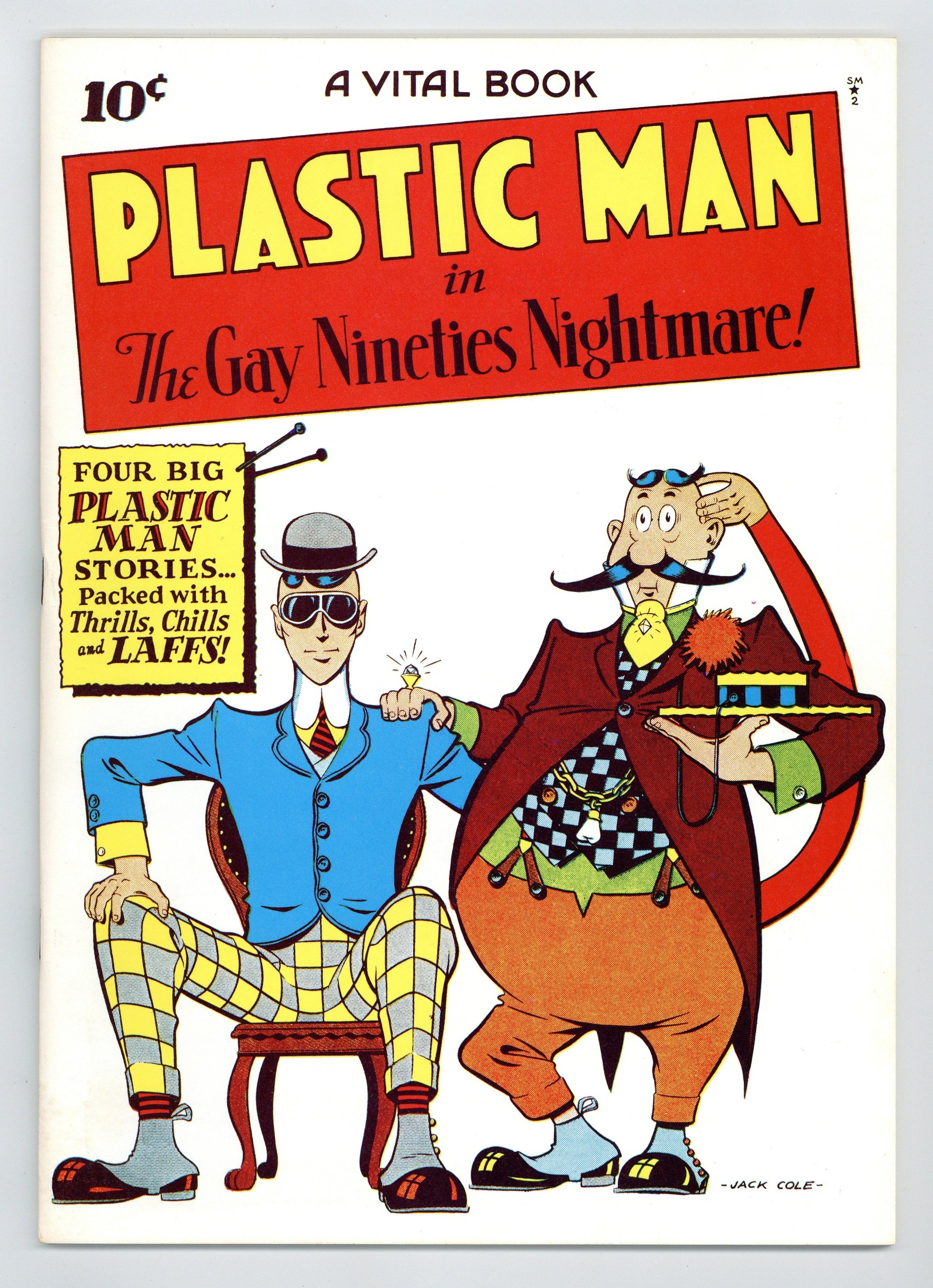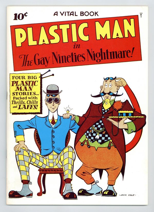 The thirty-third issue of the Flashback reprint series presents Plastic Man #2 originally published in 1944 by Vital Publications. Cover art by Jack Cole. "The Gay Nineties Nightmare" starring Plastic Man, script and art by Jack Cole; A city has been transformed to look like the gay Nineties (1890's). "Who's Who" starring Plastic Man, script and art by Jack Cole; Elmer Body has the ability to change bodies with anyone; Unfortunately for him, he chooses Woozy Winks. "The Lava Man" starring Plastic Man, script and art by Jack Cole; Fargo Freddie falls into a volcano, and turns into a Lava Man. "Welcome To Coroner's Corners!", script and art by Jack Cole; Plas and Woozy go to Coroner's Corners to try and find out why everyone has gone stark raving mad. 64-pages, full color cardstock covers, 7-3/4-in. x 10-3/8-in. black-and-white interior on white paper stock, saddle-stitched binding. Cover price $3.00.