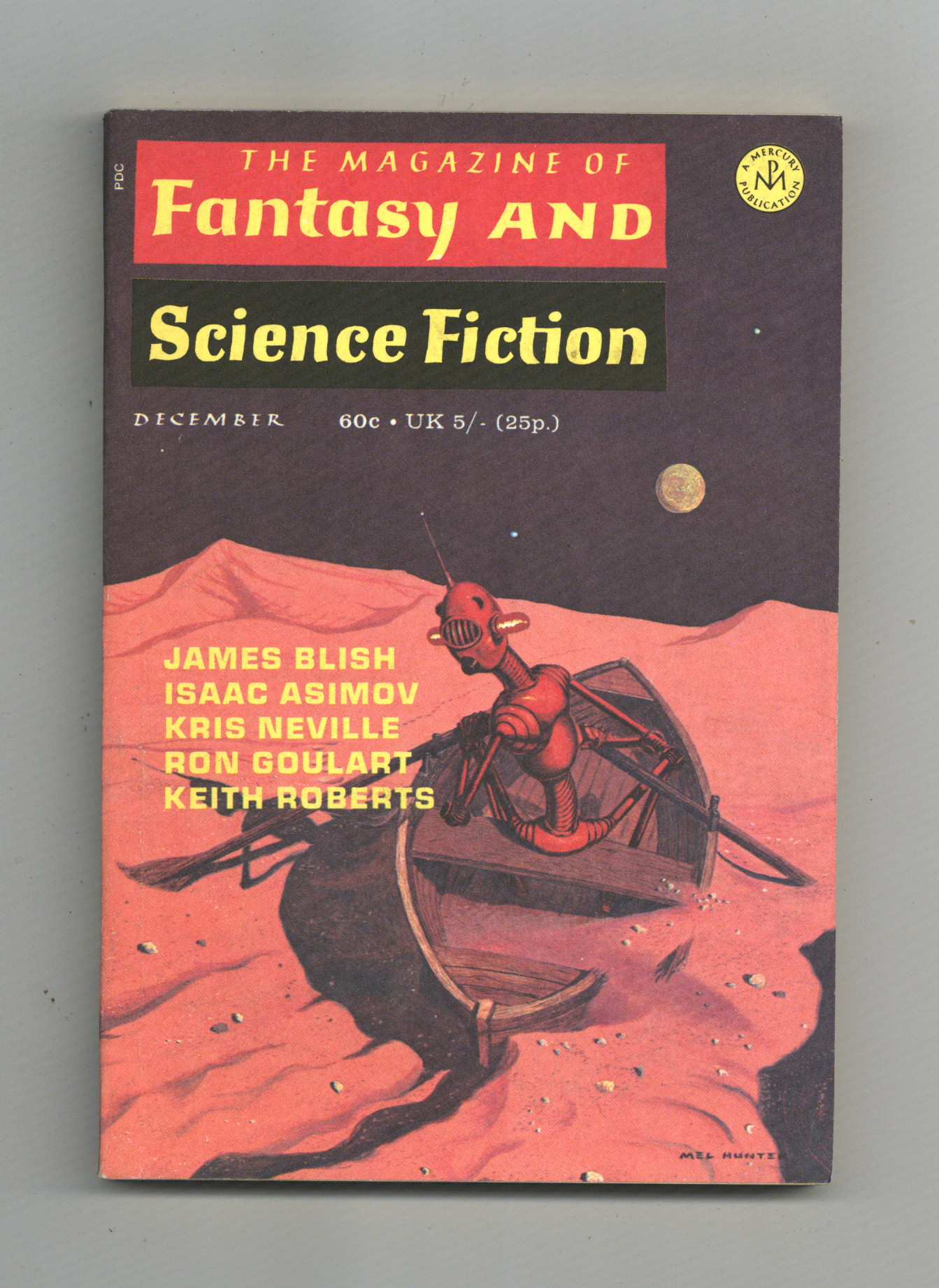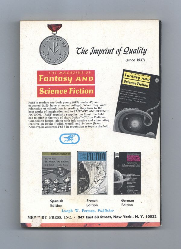 Published Dec 1970 by Mercury Publications.$15.00December 1970. Whole number 235. Cover by Mel Hunter. Science fiction stories: "Sunflower" by Ron Goulart, "The School Friend" by Robert Aickman, "Junior Partner" by Keith Roberts, "The Reality Machine" by Kris Neville, "The Run From Home" by Joe L. Hensley, "The Warmest Memory" by Bruce McAllister, "Mother's Day" by Katrina Faldt-Larsen, and "Unfinished Story" by Larry Niven. Cartoon by Gahan Wilson. Science article by Isaac Asimov. Softcover, 5-in. x 7-in., 130 newsprint pages, B&W. Cover price $0.60.