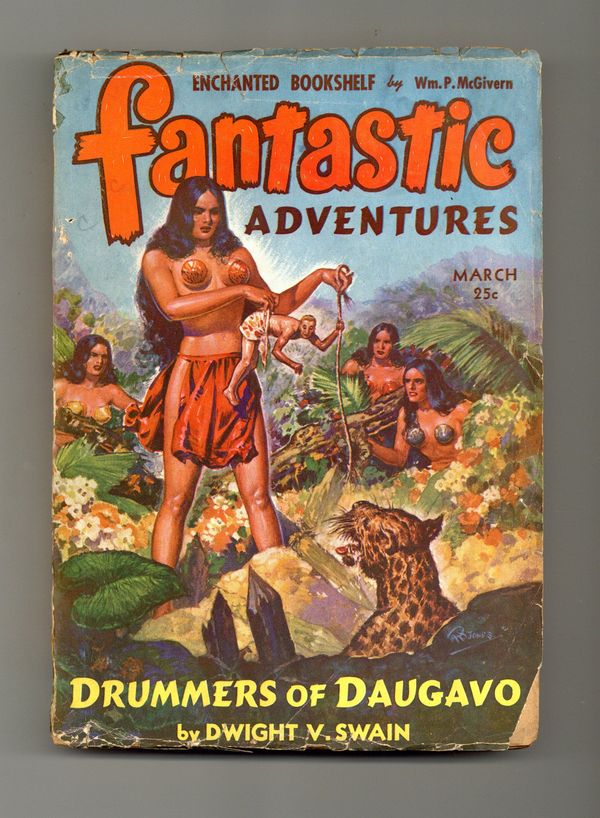 March 1943. Cover by Robert Gibson Jones. Stories by Dwight V. Swain "Drummers of Daugavo", William P. McGivern (as "P. F. Costello"), H. B. Carleton, Clee Garson, William P. McGivern (as himself), Robert Bloch "The Chance of a Ghost", Leroy Yerxa (as "Elroy Arno"), David Wright O'Brien (as "John York Cabot"), Leslie Owen, and Robert Bloch -as (Tarleton Fiske) "The Black Brain". Back cover painting by Frank R. Paul. Illustrations by Jay Jackson, Magarian, A. K. Bilder, R. G. Jones, J. Allen St. John, and Rod Ruth. 7-in. x 9.75-in.; black and white; 244 newsprint pages. Cover price $0.25.