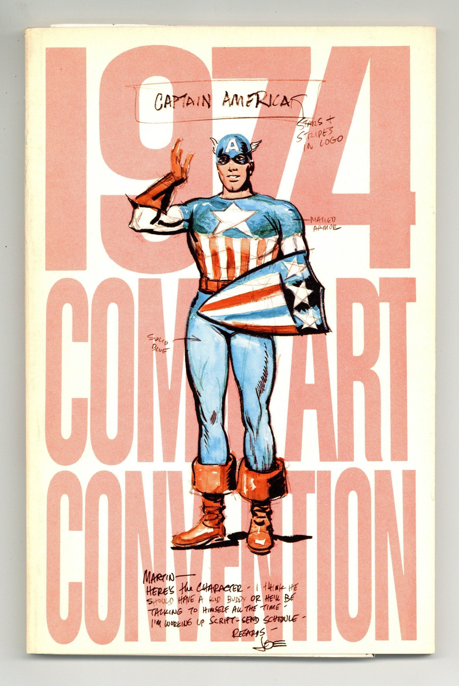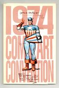 Phil Seuling's 1974 Comic Art Convention program. Golden Age Captain America cover by Joe Simon. Includes neat profiles about the artist and talents who draw and write comics. Features articles on Frank Robbins, Will Eisner, Little Annie, a luncheon interview with C. C. Beck, Sol Harrison, Bob Kane, & Russ Heath, plus much more. Squarebound; cardstock cover; 5.5-in. x 8.5-in.; black and white; 98 pages.