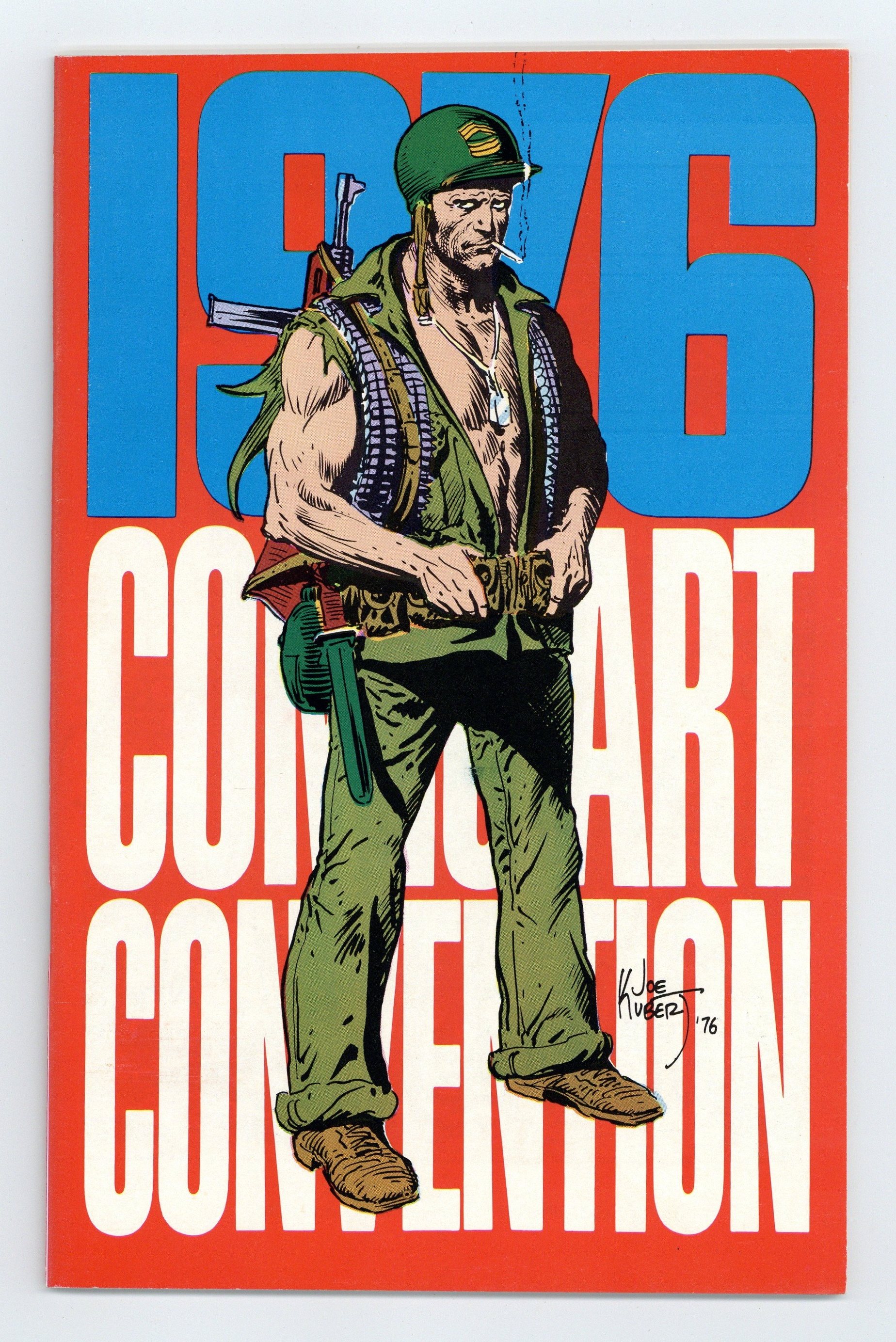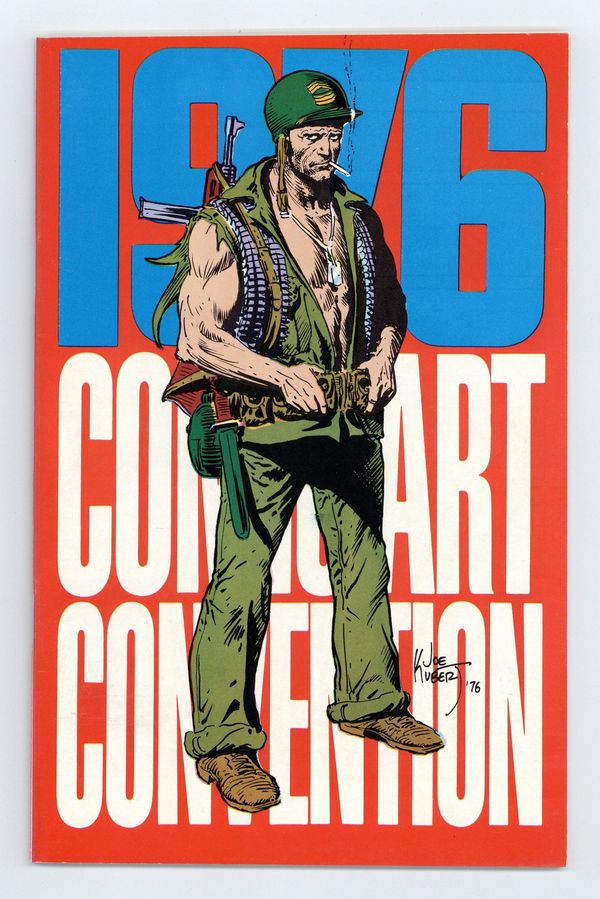 Phil Seuling's 1976 Comic Art Convention program. Sgt. Rock cover by Joe Kubert. Includes neat profiles about the artist and talents who draw and write comics. Features articles on Archie Goodwin (guest of honor), eye-catching renaissance style drawings with captions spoofing daily comic con activities and comic collecting in general -- like "Doesn't anyone buy big little books anymore?" (picture a philosopher holding an open book and looking up to the heavens, and you get the idea), a luncheon interview with Jack Kirby & Walter Gibson, plus much more. 5.5-in. x 8.5-in.; black and white; 64 pages.