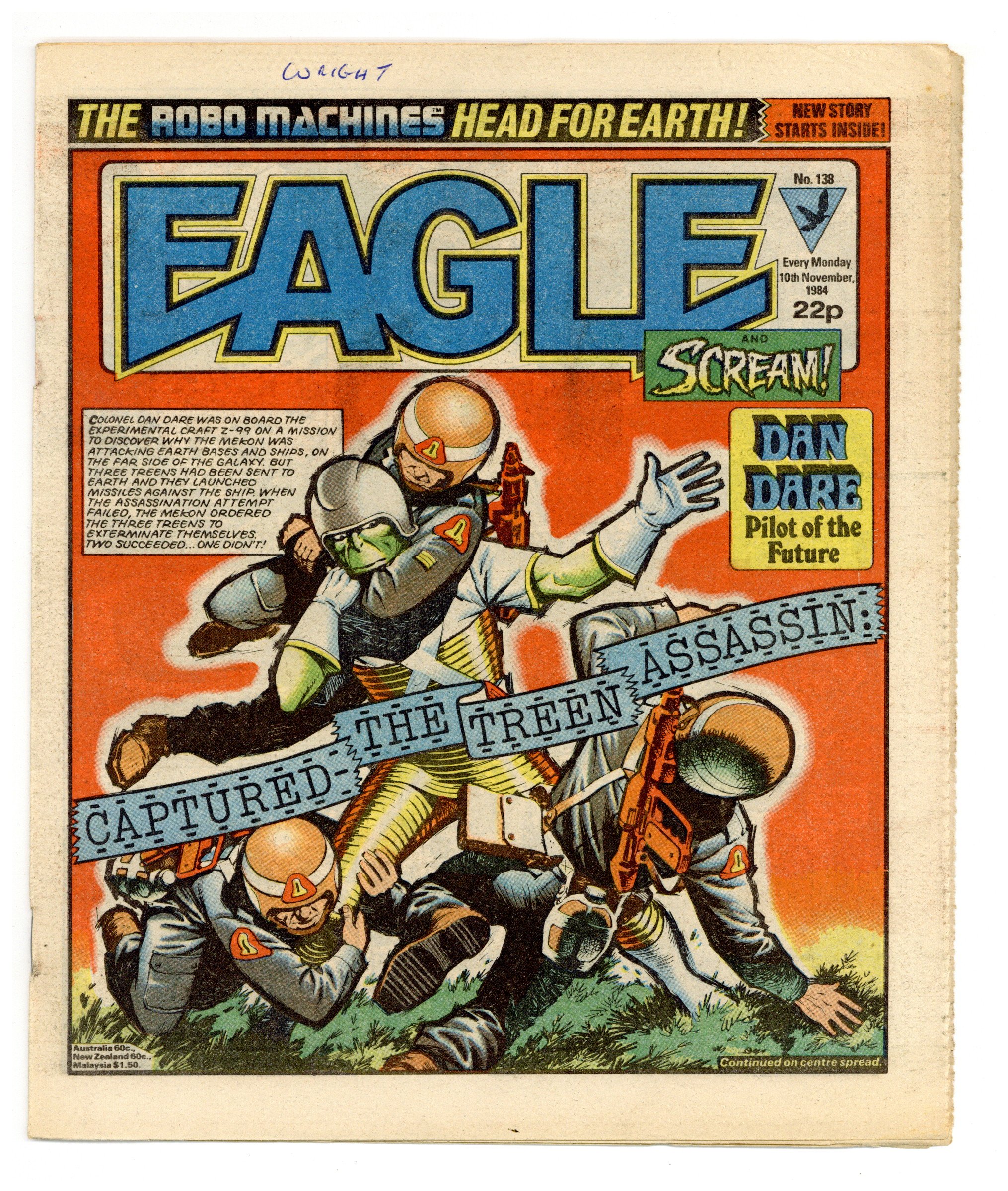 November 10th, 1984. Dan Dare, plus other features. Published in the United Kingdom, 8-1/2-in. x 11-1/2-in, 32-pages including cover, all newsprint stock. Mix of color and black/white interior.