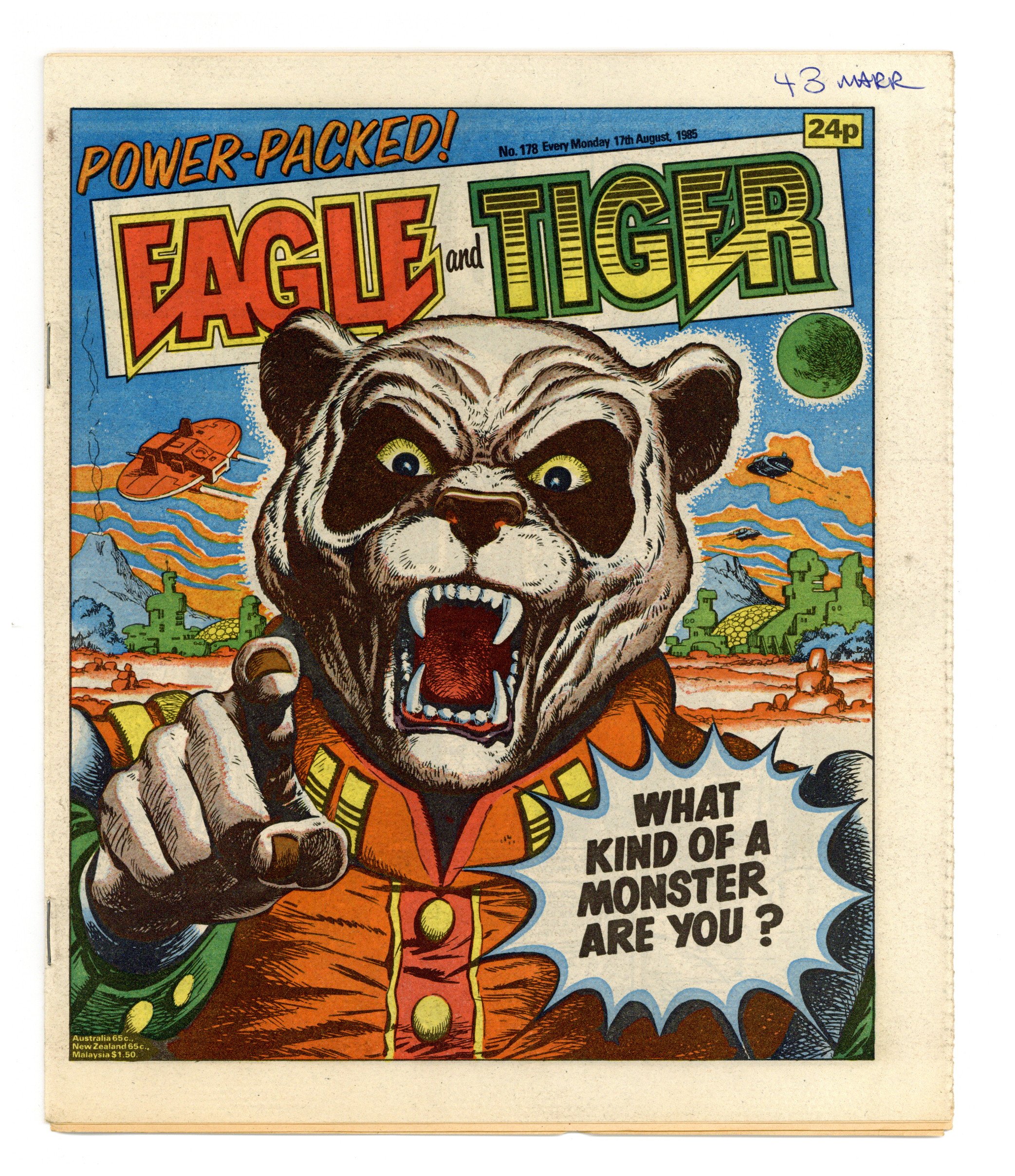 Published Aug 1985 by IPC Magazines.$9.60Dan Dare, plus other features. Published in the United Kingdom, 8-1/2-in. x 11-1/2-in, 32-pages including cover, all newsprint stock. Mix of color and black/white interior.