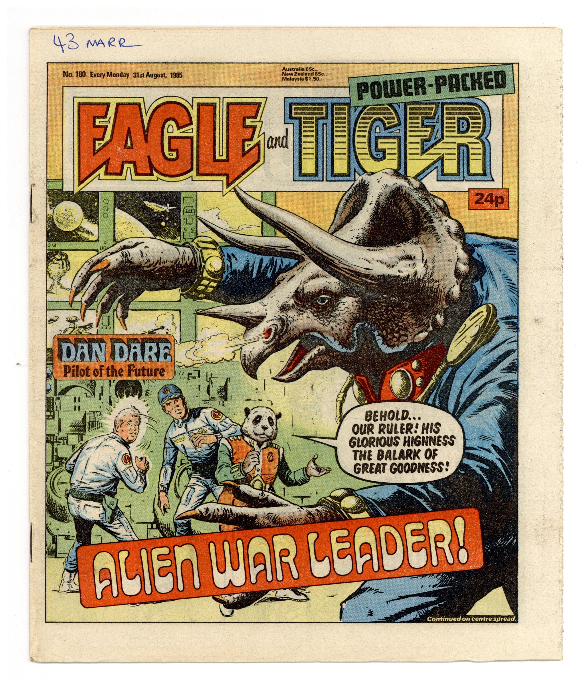Published Aug 1985 by IPC Magazines.$5.40Dan Dare, plus other features. Published in the United Kingdom, 8-1/2-in. x 11-1/2-in, 32-pages including cover, all newsprint stock. Mix of color and black/white interior.