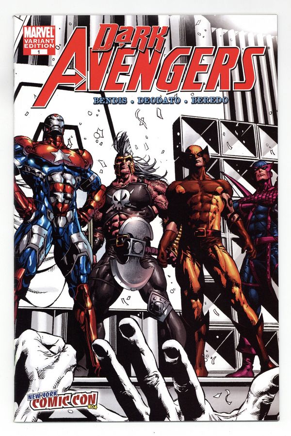 New York Comic Con Variant by Mike Deodato. Dark Reign tie-in - Written by BRIAN MICHAEL BENDIS Pencils by MIKE DEODATO. THE DARK REIGN IS HERE! The start of an explosive new era in the Avengers mythos! Who are the Dark Avengers? Who is the Iron Patriot? The answers will shock you! Brought to you by Brian Michael Bendis and Mike Deodato Jr. 32 PGS./Rated T+ $3.99 On-Sale ? 1/21