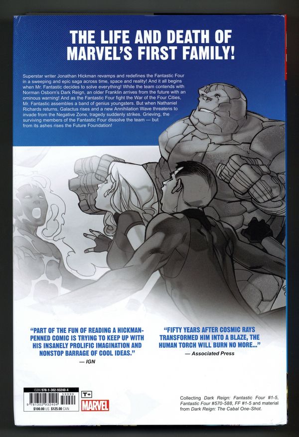 As the team contends with Norman Osborn's Dark Reign, an older Franklin arrives from the future with an ominous warning! And as the Fantastic Four fight the War of the Four Cities, Mr. Fantastic assembles a band of genius youngsters. But when Nathaniel Richards returns, Galactus rises and a new Annihilation Wave threatens to invade from the Negative Zone, tragedy suddenly strikes. Grieving, the surviving members of the Fantastic Four dissolve the team - but from its ashes rises the Future Foundation!