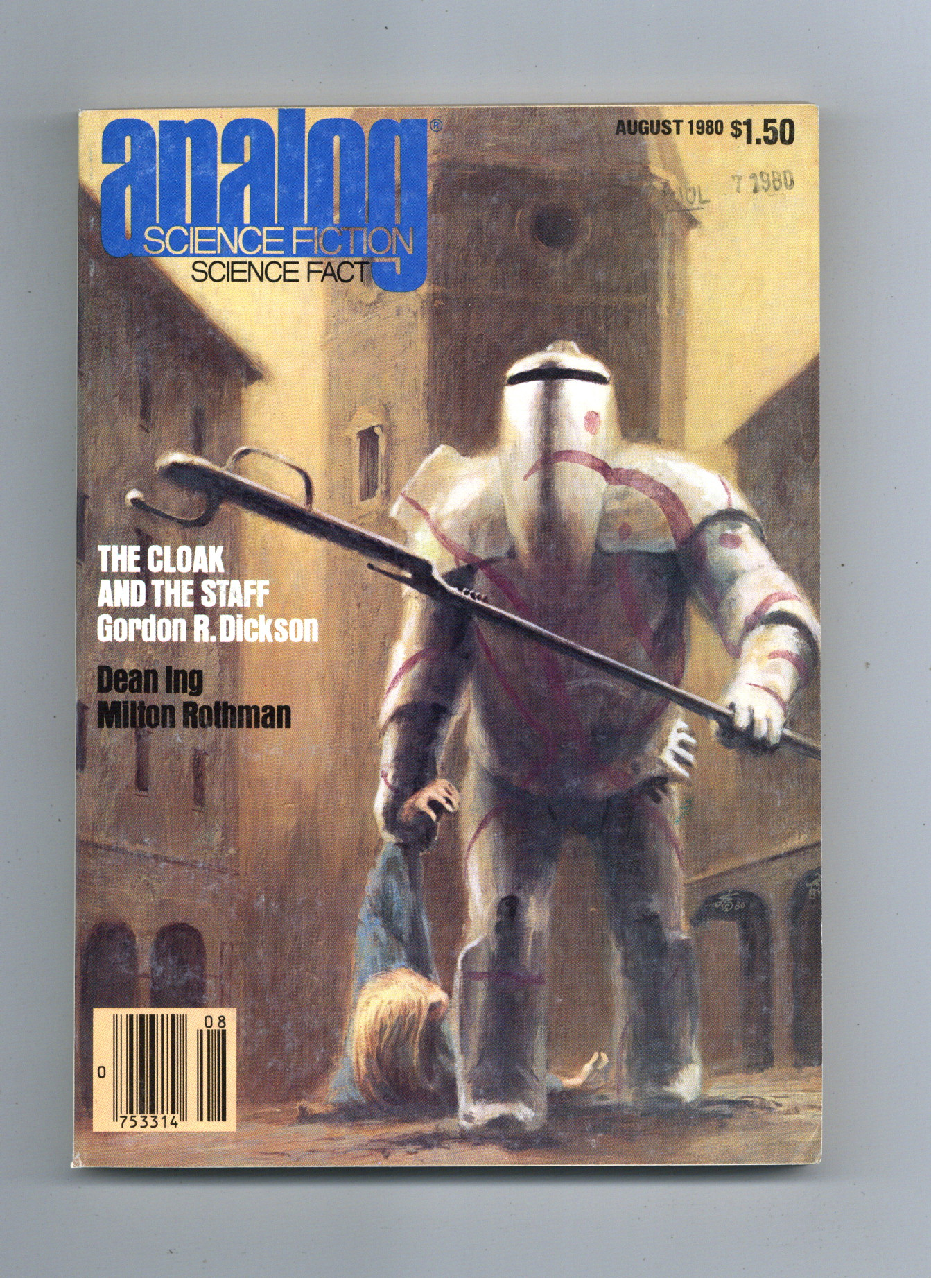 Published Aug 1980 by Dell Magazines.$4.20August 1980. Cover by John Schoenherr. Stories: "Anasazi"(Conclusion) by Dean Ing, "The Cloak and the Staff" by Gordon R. Dickson, "Federation World" by James White, "Scrooge In Space" by Sam Nicholson, and "Fit to Print" by David Lewis. Science Fact article: "Death Risk" by Milton A. Rothman. Softcover, 5.25-in. x 7.5-in.; 178 newsprint pages, B&W. Cover price $1.50.