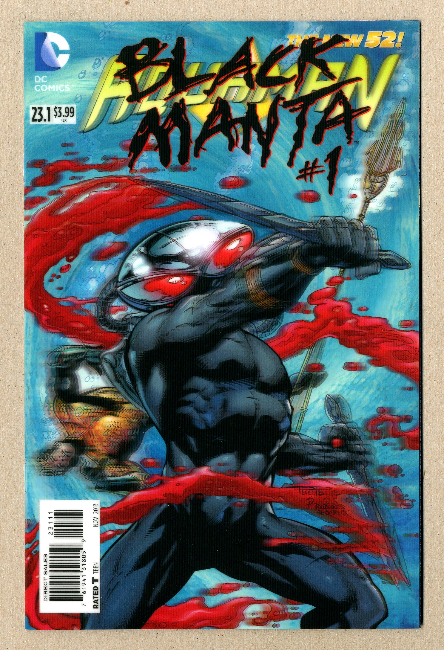"Sea Change" Written by Geoff Johns and Antony Bedard. Art by Claude St Aubin. Cover by Paul Pelletier and Sean Parsons. Set loose as the Secret Society's plan unfolds, Black Manta is shocked to learn that Aquaman may be dead! Without the object of his hatred, how will Manta claim his final vengeance against the man who killed his father? Where will one of the most lethal villains alive turn his rage when he begins a new mission? 3D Cover. Cover price $2.99.