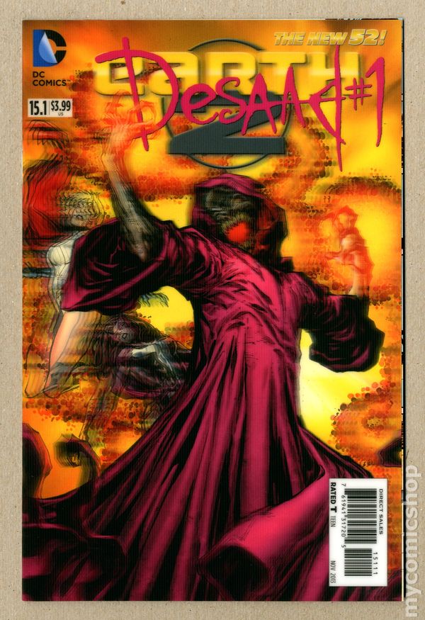 $3.603D COVER (W) Paul Levitz (A) Yildiray Cinar (CA) Ken Lashley As a member of Darkseid's inner circle, Desaad is the Apokoliptian god of fear and pain. And since being stranded on Earth because of the events of EARTH 2 #1, Desaad has looked for a way home. He has the means, in the form of Boom Tube technology, but could not power it...until now! Cover price $2.99.