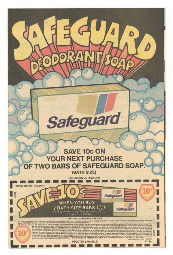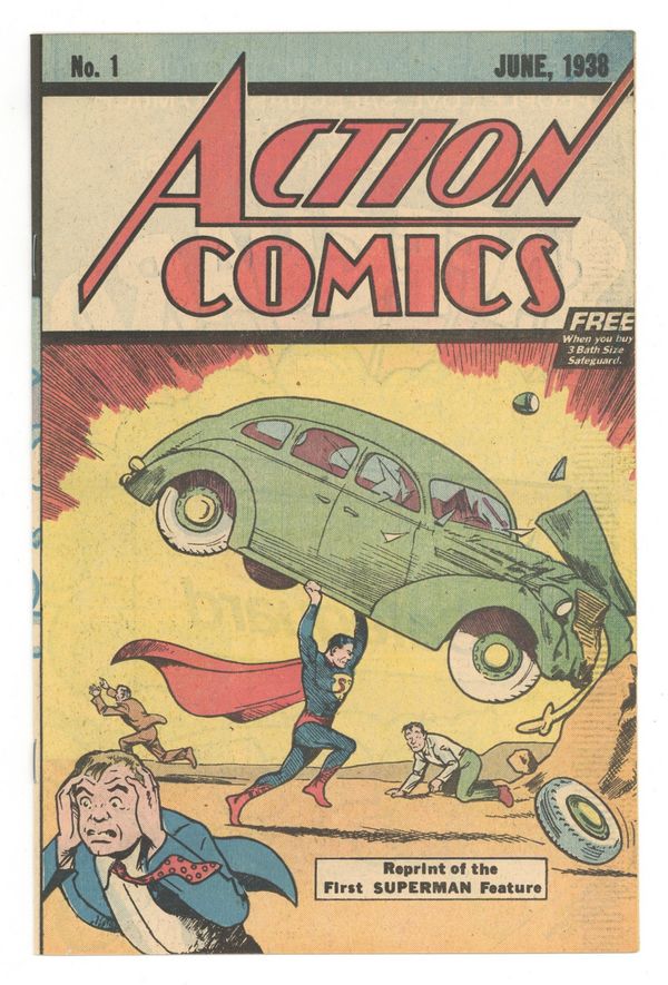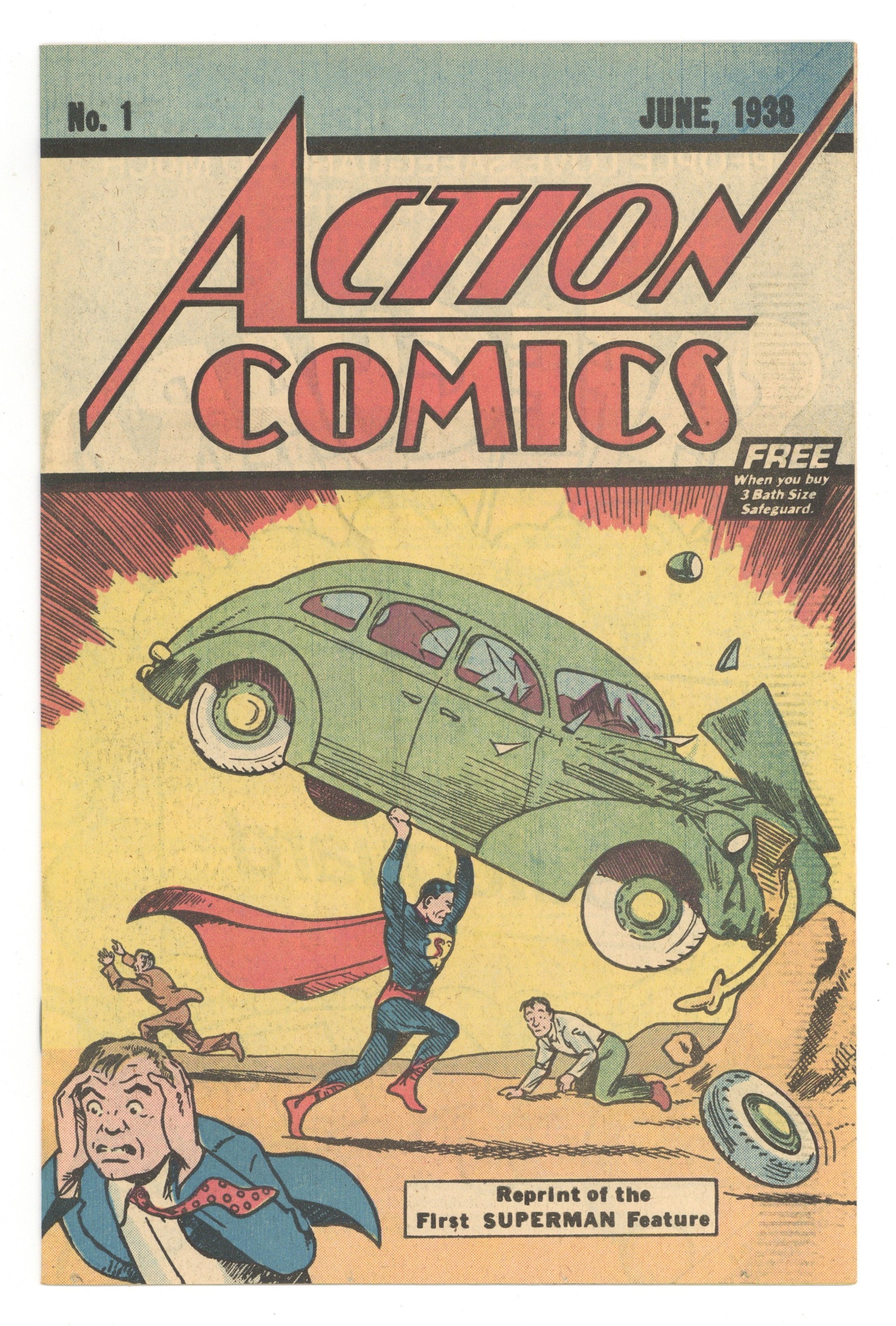 16-page reprint of complete Superman story from Action Comics #1. 1976 Safeguard reprint "Free". Paper cover. Safeguard ad on back cover.