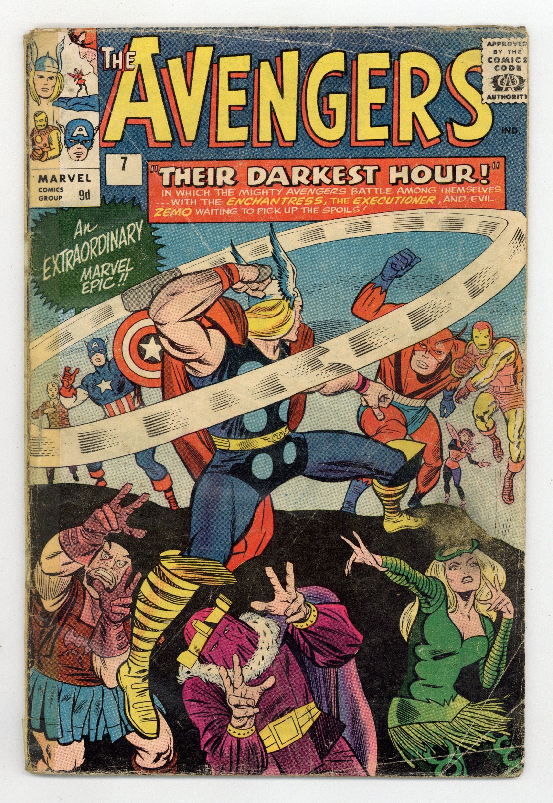 UK edition. Identical to US edition, but has 9d cover price. Cover pencils by Jack Kirby, inks by Chic Stone. Rick Jones dons Bucky's costume in "Their Darkest Hour!", script by Stan Lee, pencils by Jack Kirby, inks by Chic Stone; In Asgard, the Enchantress and the Executioner are banished to Earth by Odin; There they find Zemo (who had managed to escape the authorities) and they team up with him to stop Captain America; The Enchantress' motive is to get Thor by her side; She successfully lures Thor and hypnotizes him to fight for them; Meanwhile Captain America travels to the Amazon jungle to capture Zemo; Captain America then wins against Zemo's forces and Zemo tries to escape; Captain America grabs onto to the escape ship, however; The other Avengers fight Thor and, thanks to Iron Man, bring him back to his senses; Zemo's ship flies to the Avengers battle to rescue the Executioner and the Enchantress. Roster includes Thor, Iron Man, Giant-Man, Wasp, and Captain America. 36 pgs., full color. $0.12.