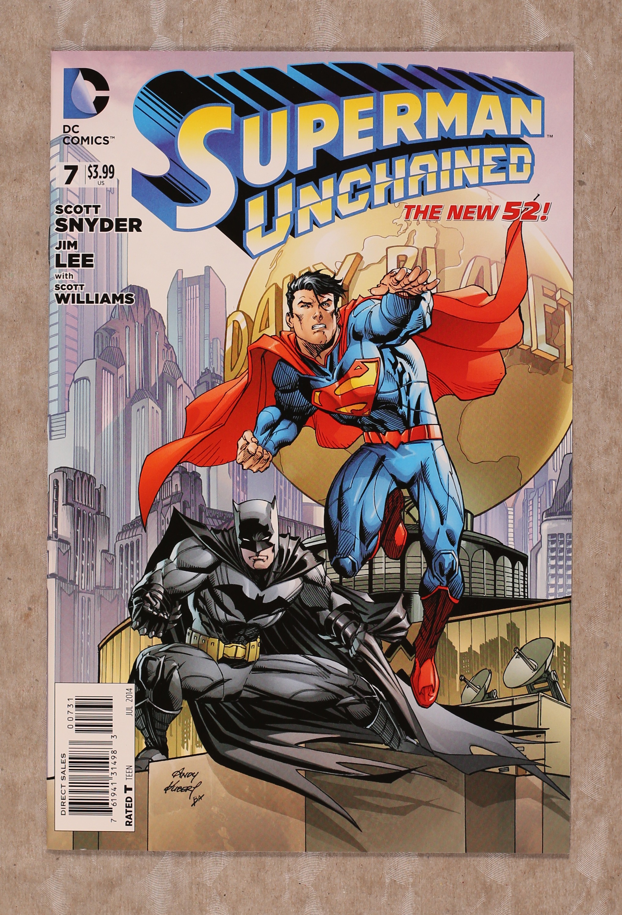 $4.00Limited 1 for 50 Retailer Incentive Variant Cover by Andy Kubert. Written by Scott Snyder. Art by Jim Lee and Scott Williams. It's a rampage in the Batcave! It's come to this: Superman, Batman and Wonder Woman against Wraith! Alone, they wouldn't have a chance - but they don't have much of one together, either! And all the while, Lex Luthor's machinations are clicking into place⦠32 pages, full color. Cover price $3.99.