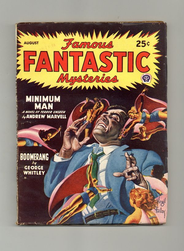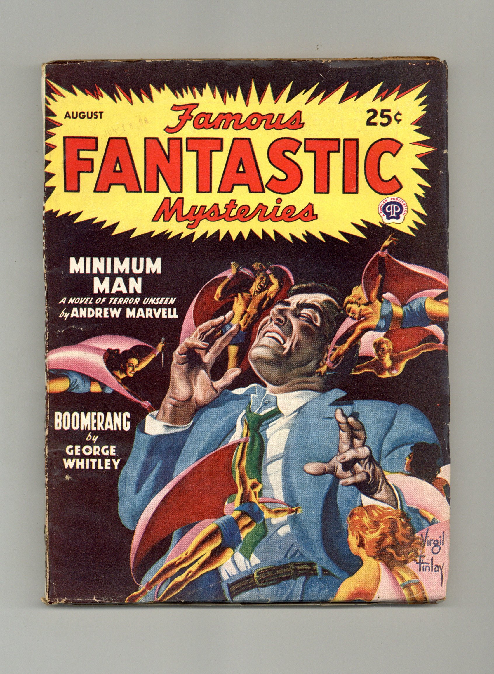 Volume 8, Issue 6 - August, 1947. Cover by Virgil Finlay. "Minimum Man, or, Time to Be Gone" by Andrew Marvell, and "Boomerang" by George Whitley. Interior Illustrations by Lawrence, Bok, and Austin. 7-in. x 9 1/2-in.; 134 Pages, B&W. Published by Popular Publications Cover price $0.25.