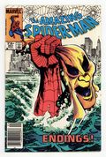 $12.00Canadian edition with $0.75 cover price. "Endings!" Part 3 of 3. Plot by Roger Stern. Script by Tom DeFalco. Art by Ron Frenz (breakdowns) and Klaus Janson (finishes). Cover by Ed Hannigan and Klaus Janson. After a pumpkin bomb sets his hideout ablaze, the furious Hobgoblin drives away in his battle van! But unbeknownst to the goblin, the web-slinger is holding on for dear life underneath! When Spider-Man crawls inside...the ferocious fight begins! As the Hobgoblin and the wall-crawler trade blows, the battle van careens into the Hudson River! Is the Hobgoblin going to sleep with the fishes? Only time will tell. Several hours later Spider-Man is drawn towards a mammoth citadel in Central Park...and then suddenly disappears! Cameo appearances by Harry Osborn, J. Jonah Jameson and Joe Robertson. (Notes: The Hobgoblin returns briefly in Amazing Spiderman 255. Tom DeFalco begins his 3-year run as the writer of the Amazing Spider-Man title. Likewise Ron Frenz begins his 3-year run as the primary penciler. This issue includes a full-page ad for the first Marvel Super Heroes Secret Wars Limited Series (where the web-slinger appears next). This three-part story was reprinted in Marvel Tales 259, 260, and 261.) Cover price $0.75.