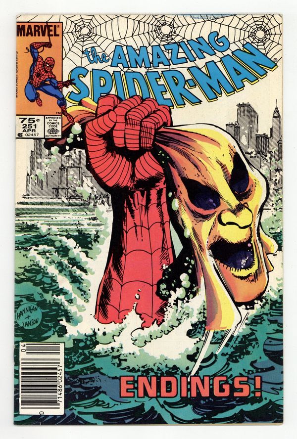 $20.00Canadian edition with $0.75 cover price. "Endings!" Part 3 of 3. Plot by Roger Stern. Script by Tom DeFalco. Art by Ron Frenz (breakdowns) and Klaus Janson (finishes). Cover by Ed Hannigan and Klaus Janson. After a pumpkin bomb sets his hideout ablaze, the furious Hobgoblin drives away in his battle van! But unbeknownst to the goblin, the web-slinger is holding on for dear life underneath! When Spider-Man crawls inside...the ferocious fight begins! As the Hobgoblin and the wall-crawler trade blows, the battle van careens into the Hudson River! Is the Hobgoblin going to sleep with the fishes? Only time will tell. Several hours later Spider-Man is drawn towards a mammoth citadel in Central Park...and then suddenly disappears! Cameo appearances by Harry Osborn, J. Jonah Jameson and Joe Robertson. (Notes: The Hobgoblin returns briefly in Amazing Spiderman 255. Tom DeFalco begins his 3-year run as the writer of the Amazing Spider-Man title. Likewise Ron Frenz begins his 3-year run as the primary penciler. This issue includes a full-page ad for the first Marvel Super Heroes Secret Wars Limited Series (where the web-slinger appears next). This three-part story was reprinted in Marvel Tales 259, 260, and 261.) Cover price $0.75.