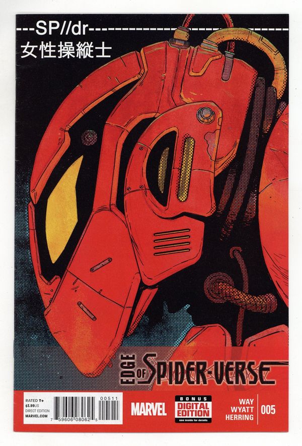 Edge of Spider-Verse: Part 8 of 10 - Written by Gerard Way. Art and Cover by Jake Wyatt. What or who is SP//dr? • Gerard Way (Umbrella Academy) makes his Marvel debut with Jake Wyatt (Ms. Marvel, Indestructible Hulk) establishing a new universe and the incredible Spider character who inhabits it! 28 pages, full color. Rated T+ Cover price $3.99.