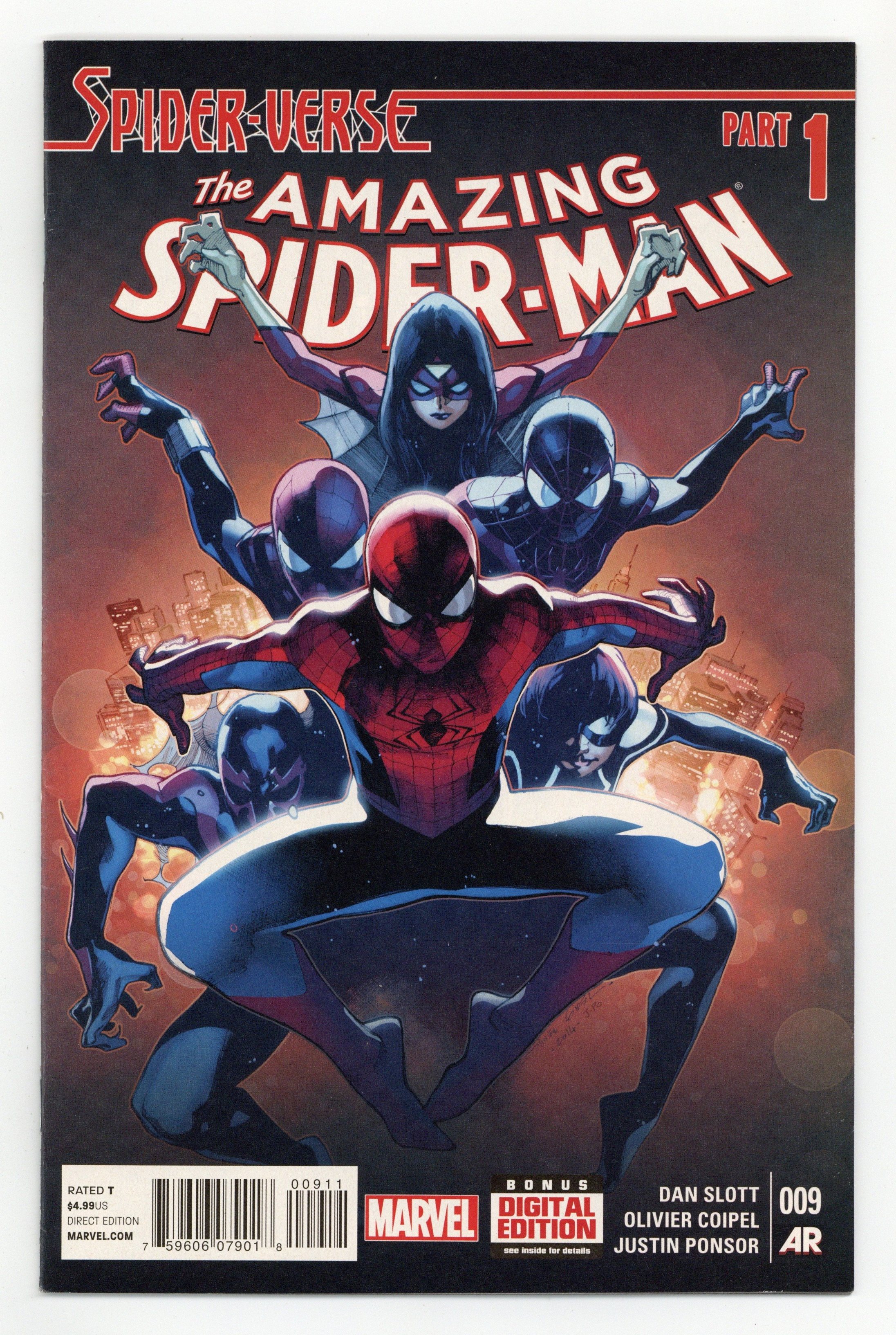 Tags: Marvel Legacy Numbering: Amazing Spider-Man (part 742), Spider-Verse (Marvel) (part 1), Spider-Man$28.00Spider-Verse: Part 1 of 6 - Written by Dan Slott. Art by Olivier Coipel, Giuseppe Camuncoli and Cam Smith. Cover by Olivier Coipel. SPIDER-VERSE BEGINS HERE! When a force of evil threatens spider-characters throughout the multiverse, EVERY SPIDER-MAN EVER is needed to save the day! Cover price $4.99.