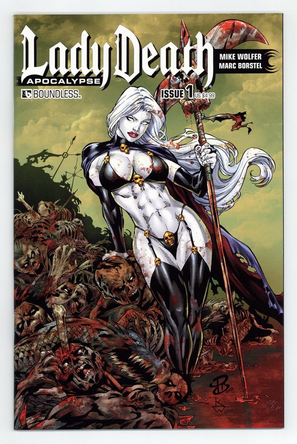 $18.00Written by Mike Wolfer. Art by Marc Borstel. Cover by Renato Camilo. The Queen of the Dead is back to life with an all-new series at Boundless! This super-size #1 features the start of a new fully-painted series from artist Marc Borstel but also has a giant story-so-far to bring all readers up to speed on previous series and make this a perfect place for new readers to start. Much has changed during Lady Death's absence from the Under Realm, most notably the near-extinction of the warrior class Demons. What devastating effects the demon annihilation will have on the Under Realm remains to be seen, but Hope cannot stand-by idly as a convoy of enslaved demons rolls through the night toward its captives' oblivion. As her plans of rising to power depend on the loyal foot-soldiers she abandoned, now she must rescue them at all cost. The biggest Lady Death epic to date kicks off here! 48 pages, full color. Cover price $4.99.