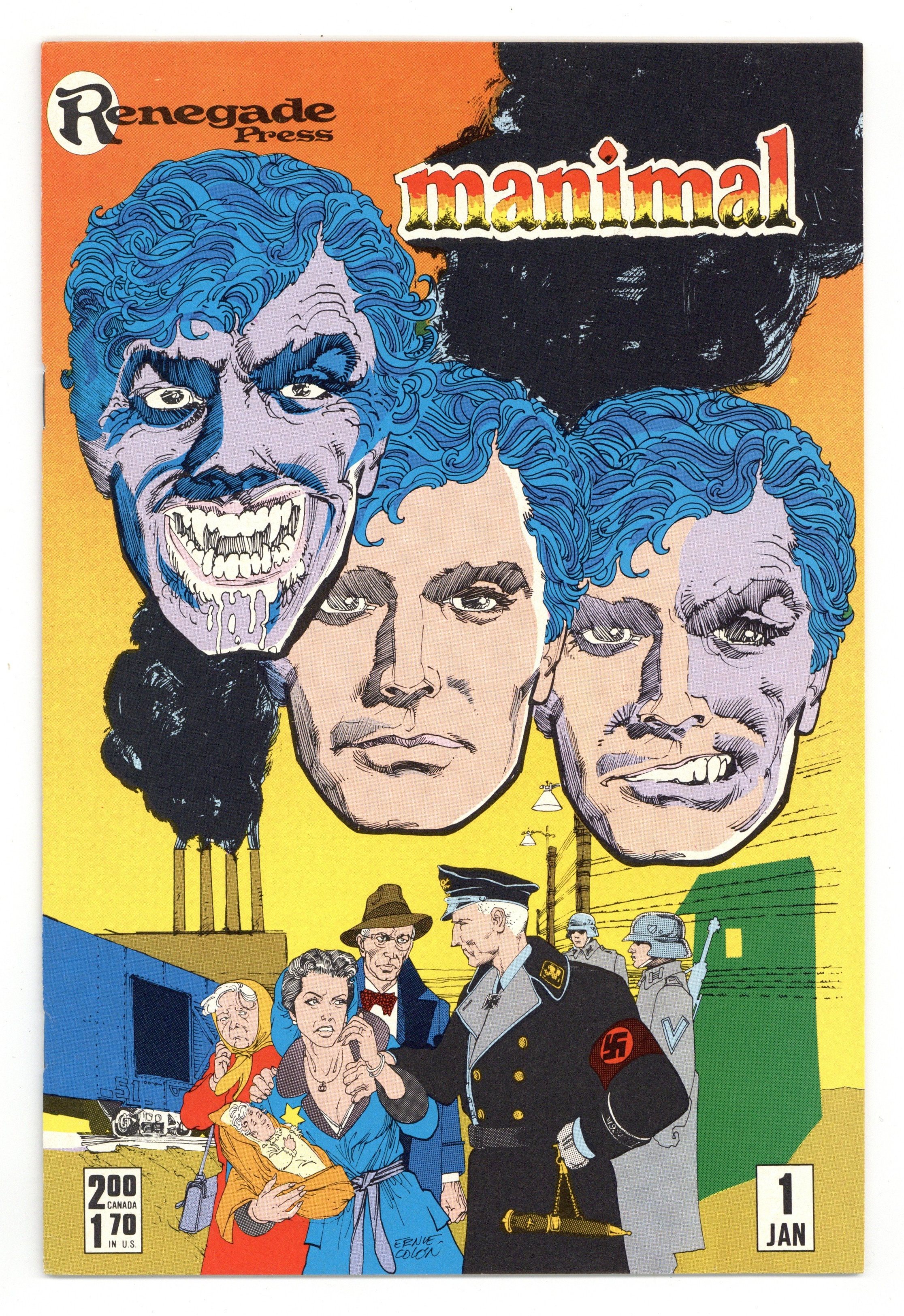 Published Jan 1986 by Renegade Press.$14.00Stories, art and cover by Ernie Colon. Collects Manimal stories that were originally published in the 1970s fantasy anthology Hot Stuf', with story and art by legendary artist Ernie Colon. A man with beast-like powers seeks revenge on the Nazi commandant who murdered his family. No relation to the short-lived TV series of the same title. Manimal; Manimal: Afterthought; Tender Machine 10061. 36 pages, B&W. Mature readers. Cover price $2.00.