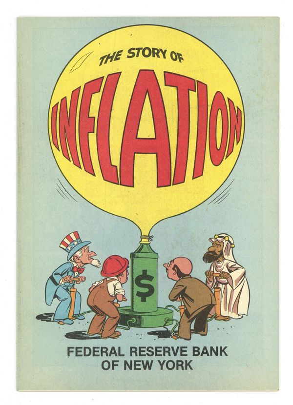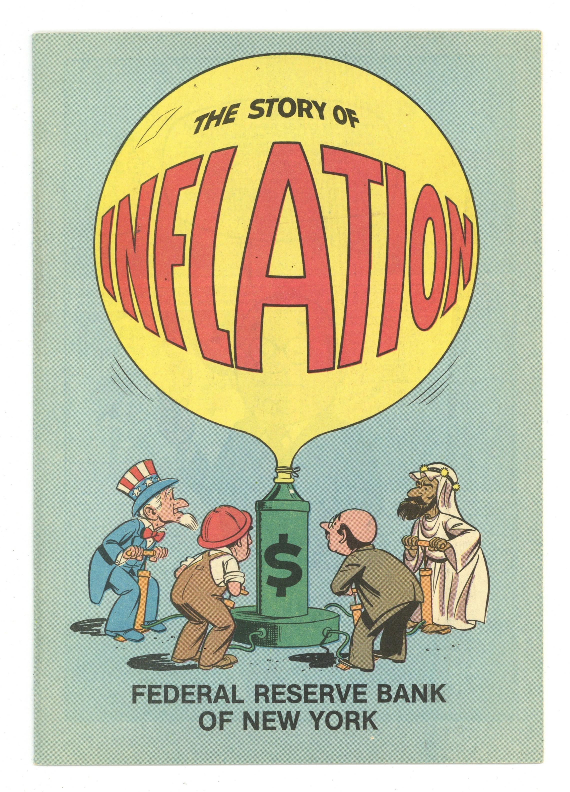 Published 1981 by Federal Reserve Bank.$7.00The Story of Inflation (1981) is a promotional comic distributed by the Federal Reserve Bank. It discusses inflation and what's happening, why and what can be done. Includes an interesting and informative look at how our modern financial system works. Full color, 24 pages, 6.75-in. x 9.75-in., all newsprint, no cover price.