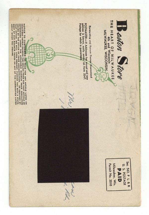 Tags: SupermanPublished Aug 1945 by Tim's Official Store.$53.00#33 in a series of 90. Superman-Tim is a boys' clothing catalog, activity book, and comic book all rolled into one, featuring Superman illustrations throughout. All issues are 16 pages unless a Superman story is inserted (bringing page count to 24 or 36 pages). Every issue encourages boys to not be a "Whoo-Shoo" -- a boy who reads "Superman-Tim" but doesn't buy clothes from the Superman-Tim Store. Copyright 1945 by Superman, Inc., under license to Tim Promotions, Inc. B&W with a single color, 5 1/2 in. x 8 in.
