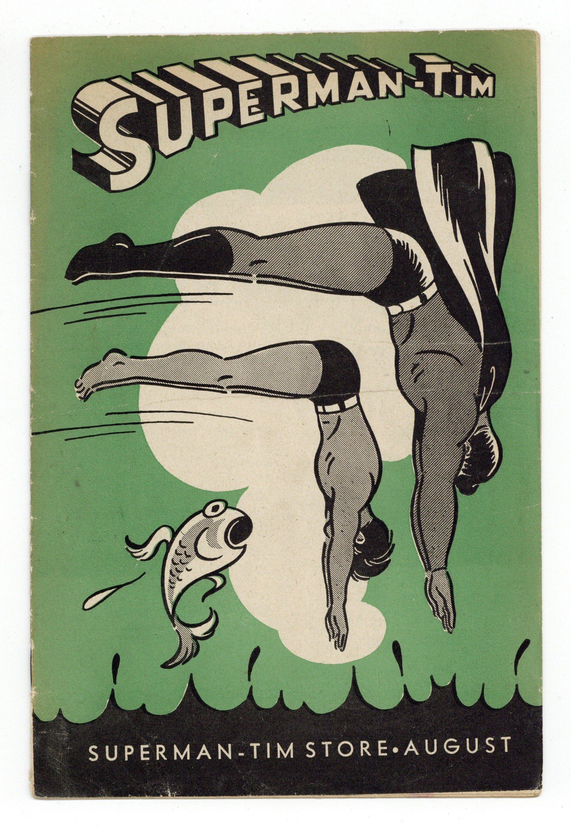 Tags: SupermanPublished Aug 1945 by Tim's Official Store.$29.50#33 in a series of 90. Superman-Tim is a boys' clothing catalog, activity book, and comic book all rolled into one, featuring Superman illustrations throughout. All issues are 16 pages unless a Superman story is inserted (bringing page count to 24 or 36 pages). Every issue encourages boys to not be a "Whoo-Shoo" -- a boy who reads "Superman-Tim" but doesn't buy clothes from the Superman-Tim Store. Copyright 1945 by Superman, Inc., under license to Tim Promotions, Inc. B&W with a single color, 5 1/2 in. x 8 in.