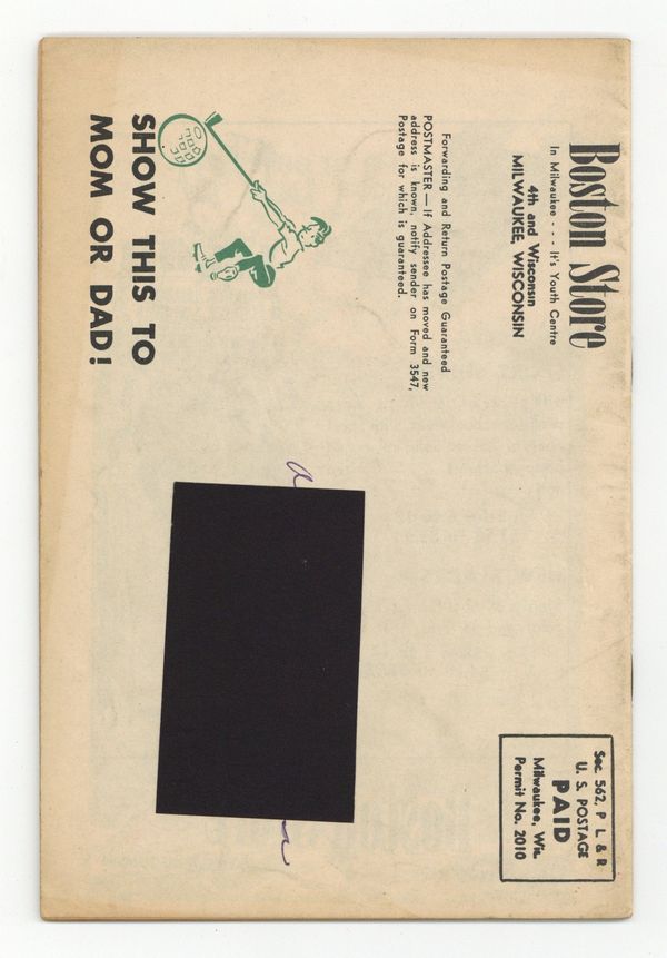 Tags: SupermanPublished Aug 1947 by Tim's Official Store.$75.00#57 in a series of 90. Superman-Tim is a boys' clothing catalog, activity book, and comic book all rolled into one, featuring Superman illustrations throughout. All issues are 16 pages unless a Superman story is inserted (bringing page count to 24 or 36 pages). Every issue encourages boys not to be a "Whoo-Shoo" -- a boy who reads "Superman-Tim" but doesn't buy clothes from the Superman-Tim Store. This issue features Superman and Tim in a 16 page comic adventure entitled, "The Adventure of the Sea of the Serpent." Copyright 1947 by National Comics Pub., Inc., under license to Tim Promotions, Inc. B&W with a single color, 5 1/2 in. x 8 in.