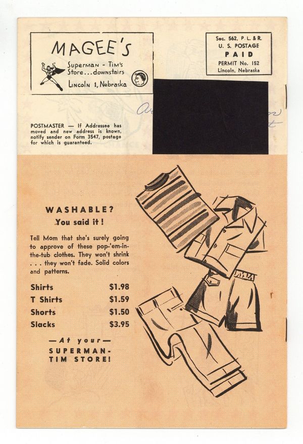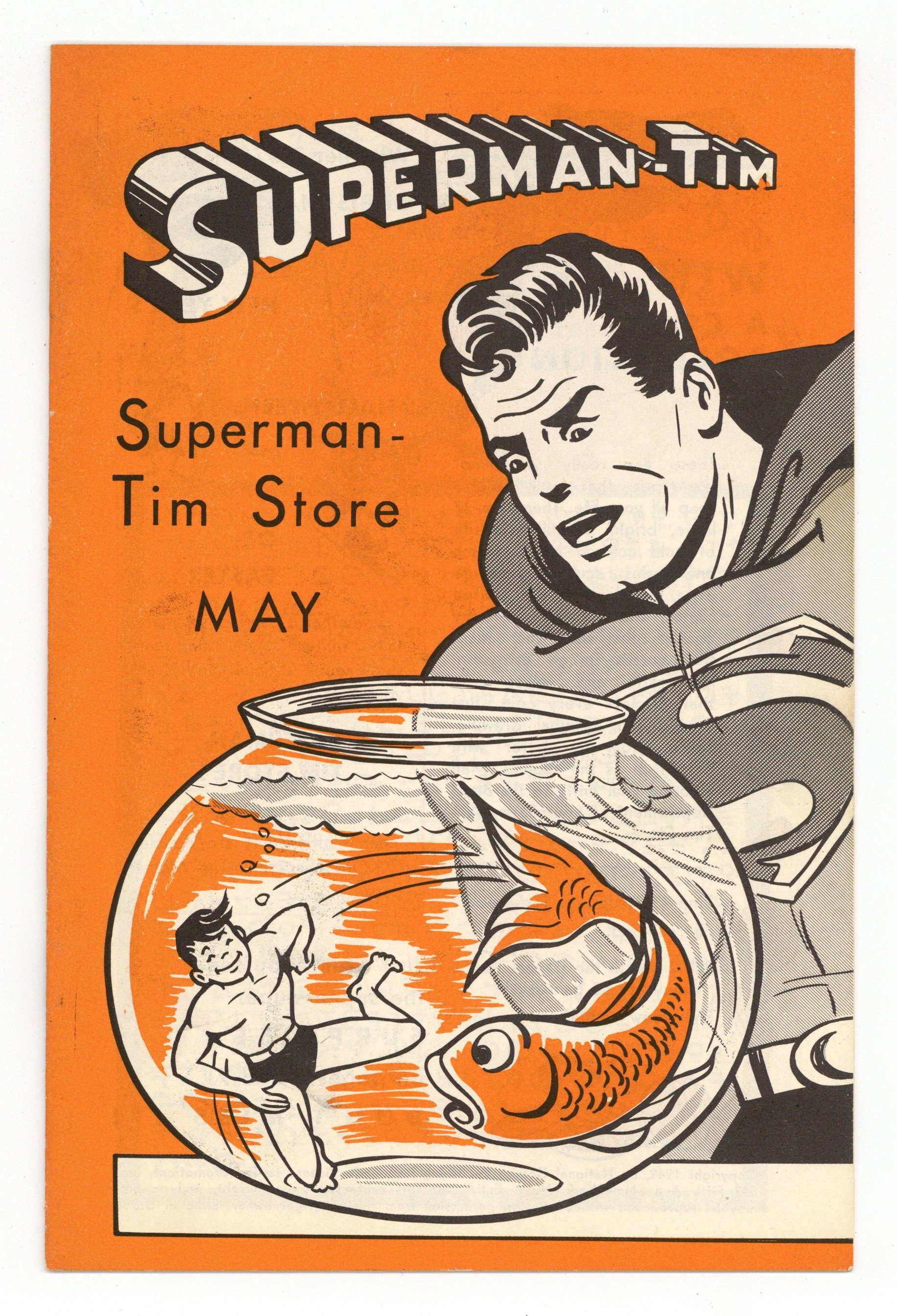 #78 in a series of 90. Superman-Tim is a boys' clothing catalog, activity book, and comic book all rolled into one, featuring Superman illustrations throughout. All issues are 16 pages unless a Superman story is inserted (bringing page count to 24 or 36 pages). Every issue encourages boys not to be a "Whoo-Shoo" -- a boy who reads "Superman-Tim" but doesn't buy clothes from the Superman-Tim Store. Copyright 1949 by National Comics Pub., Inc., under license to Tim Promotions, Inc. B&W with a single color, 5 1/2 in. x 8 in.