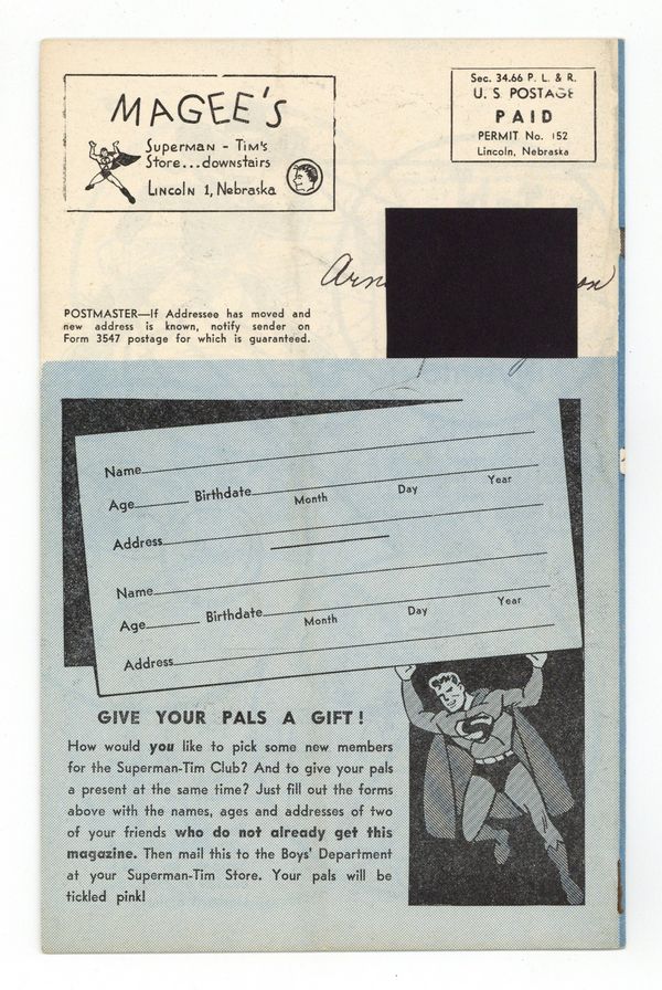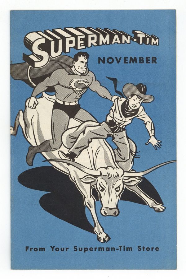 #84 in a series of 90. Superman-Tim is a boys' clothing catalog, activity book, and comic book all rolled into one, featuring Superman illustrations throughout. All issues are 16 pages unless a Superman story is inserted (bringing page count to 24 or 36 pages). Every issue encourages boys not to be a "Whoo-Shoo" -- a boy who reads "Superman-Tim" but doesn't buy clothes from the Superman-Tim Store. Copyright 1949 by National Comics Pub., Inc., under license to Tim Promotions, Inc. B&W with a single color, 5 1/2 in. x 8 in.