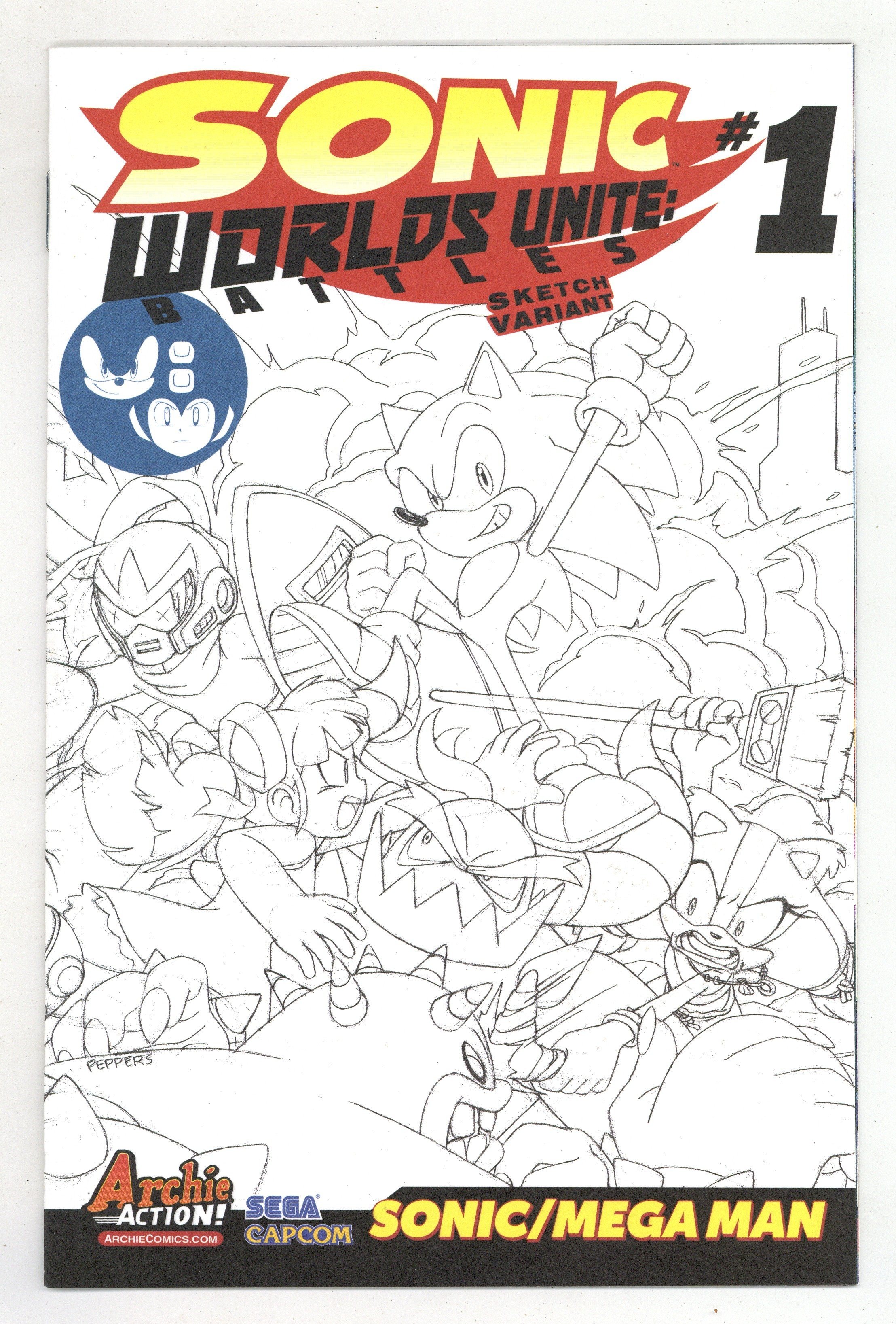Tags: Sonic The HedgehogPublished Sep 2015 by Archie Publications.$12.00Worlds Unite Tie-In - Written by Joel Enos, Ryan Jampole and Aleah Baker. Art by Tracy Yardley, Ryan Jampole and Diana Skelly. Cover by Jamal Peppers. All-New Direct Market-Exclusive special! There are so many epic battles in the Sonic/Mega Man crossover event that the biggest brawls of the bunch have exploded into their very own book! Twelve issues just isn't enough to contain all the frantic action of 'Worlds Unite!' The action spills over into this second special stand-alone issue where an all-star cast of creators bring you an extraordinary all-action issue! Watch as Sonic battles the Deadly Six, Knuckles throws down with Break Man, and Sticks goes after Roll! 32 pages, full color. Cover price $3.99.