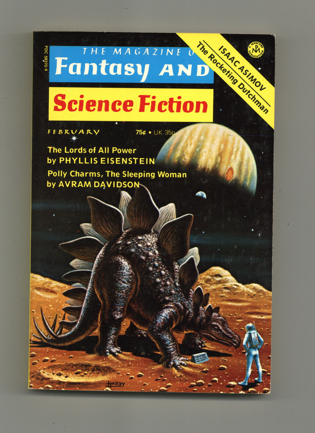 Published Feb 1975 by Mercury Publications.$28.00February 1975. Cover by David Hardy. Fantasy and science fiction stories: "The Lords of All Power" by Phyllis Eisenstein, "Retrograde Summer" by John Varley, "Polly Charms, The Sleeping Woman" by Avram Davidson, "The Killing of Mother Corn" by Dennis O'Neil, "Innocence" by Joanna Russ, "With The Evening News" by Richard Lupoff. "Something Had To Be Done" by David Drake. Softcover Pulp Digest, 5 1/2-in x 7 1/2-in, 162 Pages, B&W. Cover price $1.00.