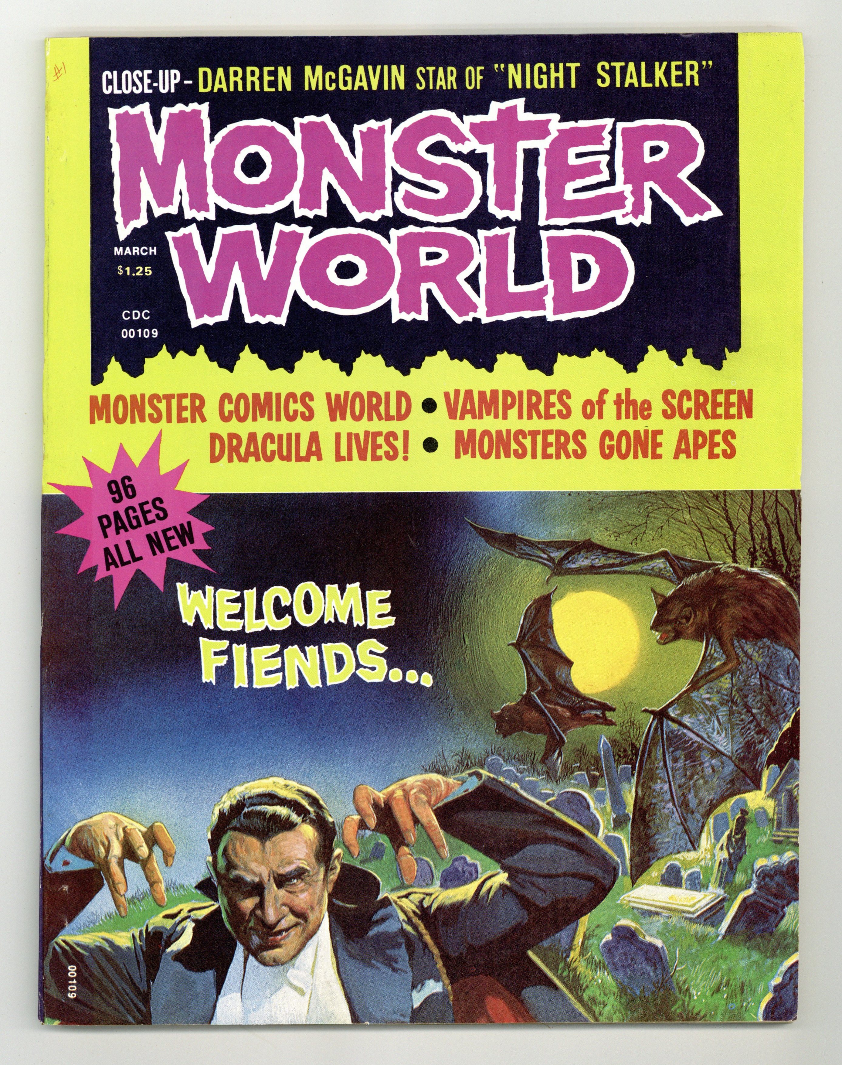 March 1975, Volume 1, Issue 1. NOTE: Issues #1 & 2 of this series are titled Monster World. In this issue: Dracula Lives! Are there such beings as Vampires and Werewolves?, Close-up with Darren McGavin (star of Kolchak: the Night Stalker), 6 page horror comic strip "Common Dandruff" written by Tony Tallarcio and penciled by Jose Delbo, Possession by Demons, Korg: 70,000 BC, plus more. Approx 8.5-in. x 11-in.; black and white; 96 pages. Cover price $1.25.