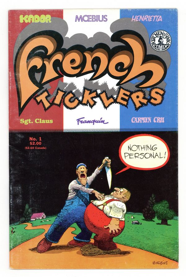 Cover by Moebius. Edited by Randy Lofficier and Jean-Marc Lofficier. Stories by Moebius, Philippe Dupuy and Charles Berberian, Jean-Marc Lelong, Christian Binet, Andre Franquin, and Daniel Goossens. A Kitchen Sink Press anthology presenting popular French cartoonists in English, including several Moebius stories and some of the earliest translations of Dupuy and Berberian, later of Monsieur Jean fame. 24 pages, B&W. Mature Readers. Cover price $2.00.