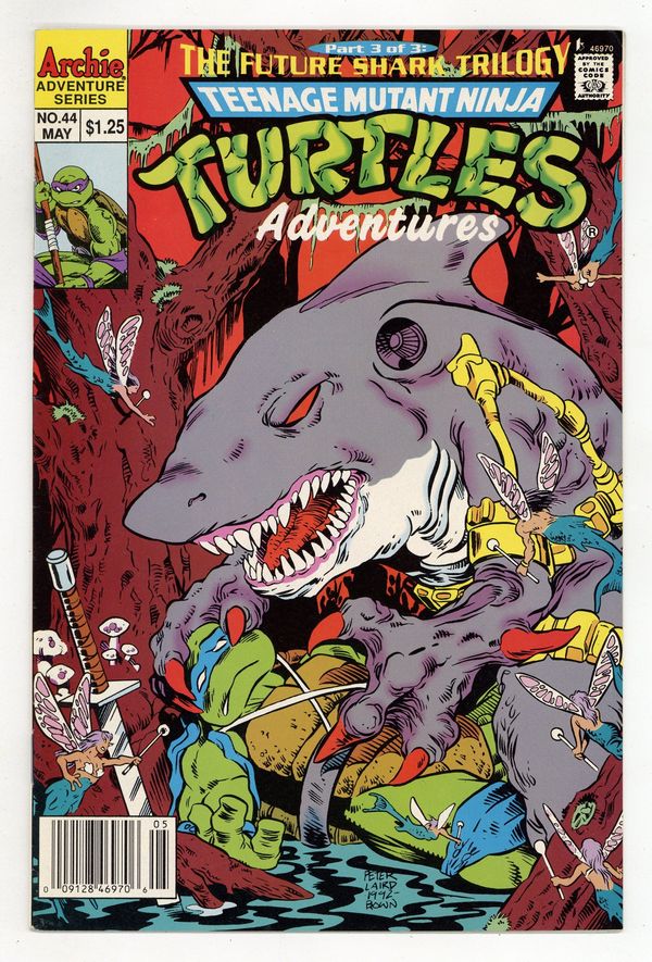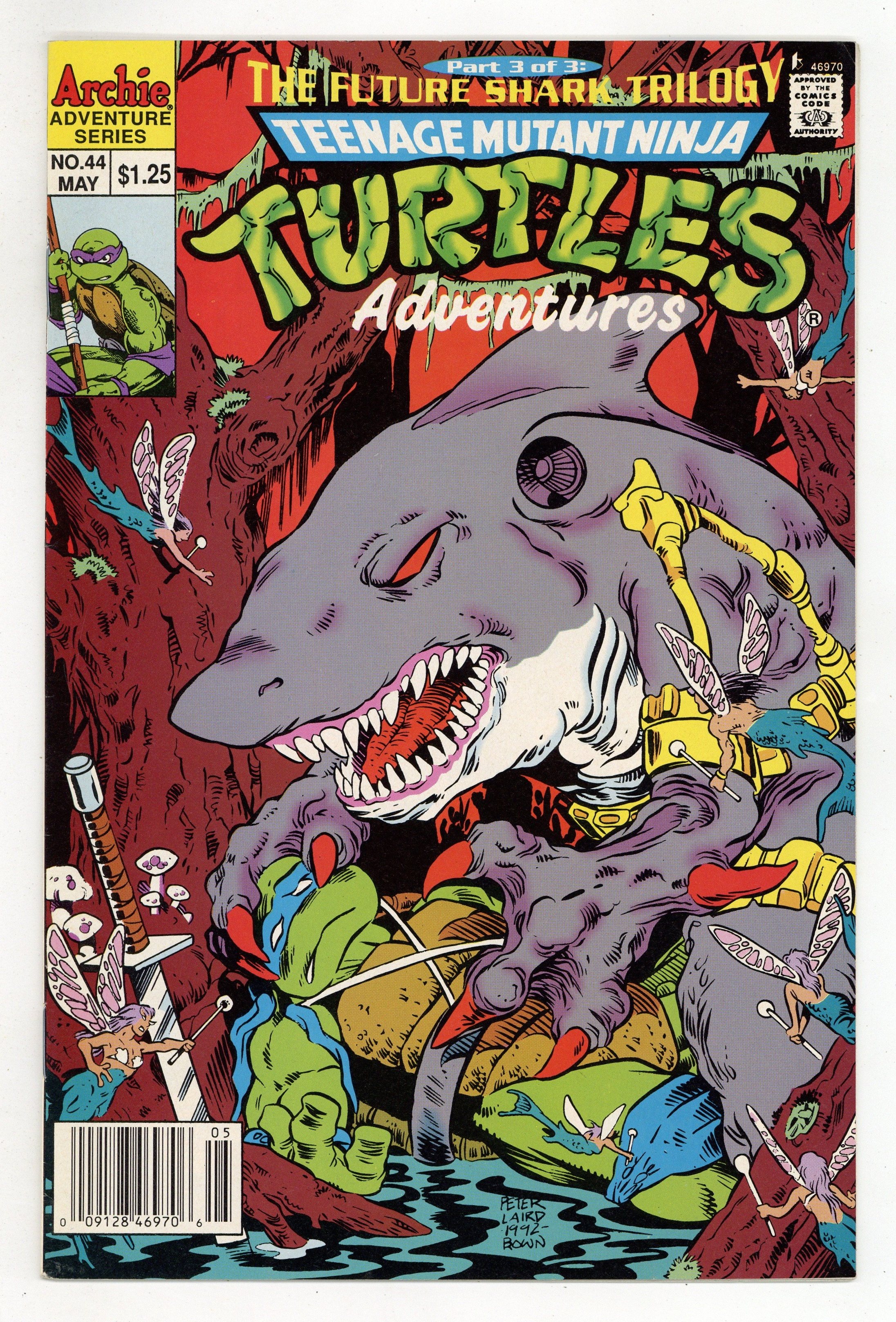 "The Future Shark Trilogy, Part Three: Here Today, Gone Tomorrow" - Written by Dean Clarrain and Chris Allan. Art by Chris Allan and Jon D'Agostino. Cover by Peter Laird and Ryan Brown. The dramatic conclusion to the "Future Shark" trilogy! Guest starring the Shredder, Verminator-X and the Merdude! 32 pages, full color. Cover price $1.25.