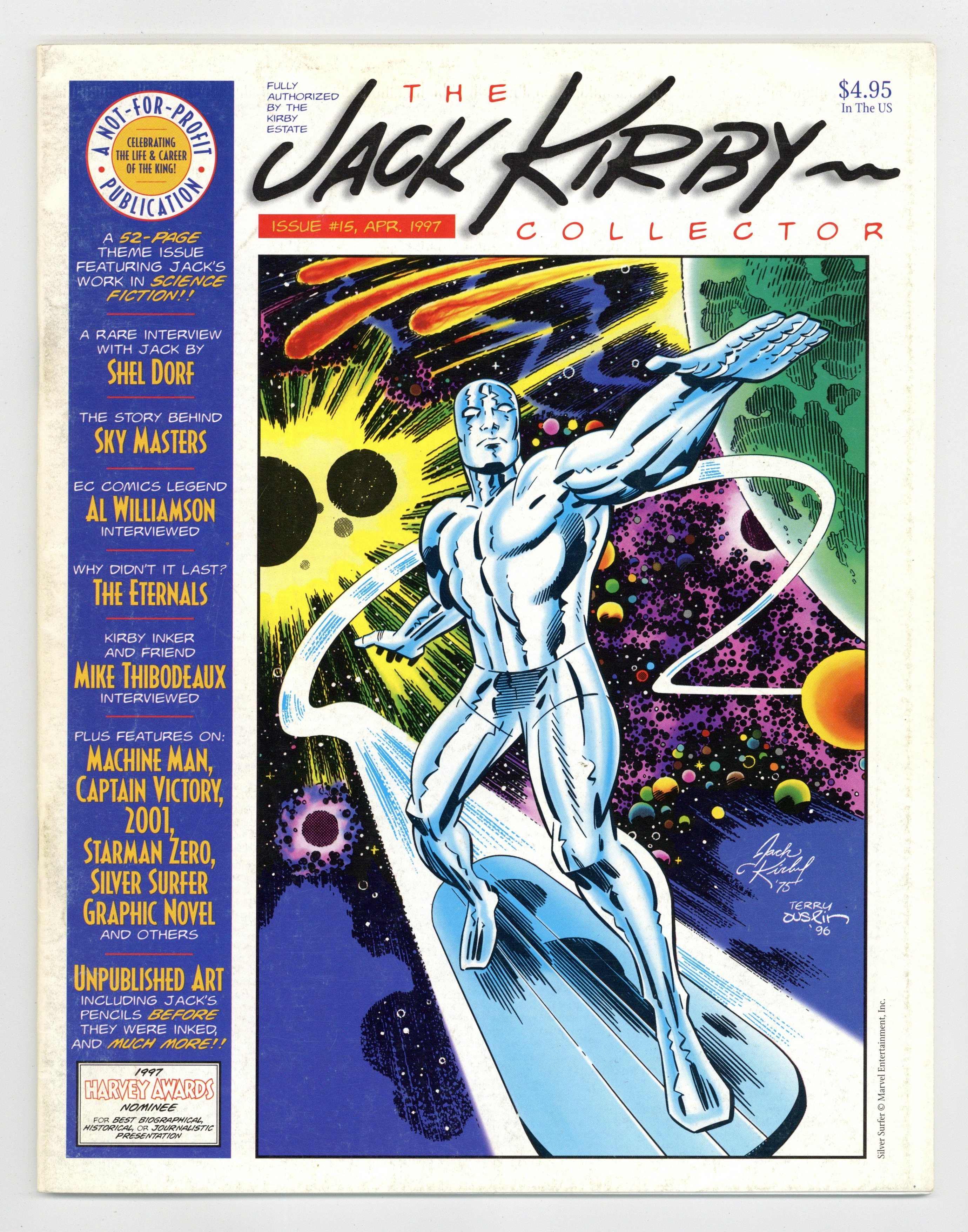 Tags: Jack Kirby Collector (part 15)Published Apr 1997 by TwoMorrows.$14.50Jack Kirby Collector #15. April 1997 - 52 pages. Science Fiction A Rare Interview with Jack by Shel Dorf; EC Comics Legend Al Williamson interviewed; The Story Behind Sky Masters; Why Didn't the Eternals Last?; Kirby Inker and close friend Mike Thibodeaux interviewed; Plus features on Machine Man, Captain Victory, 2001, Starman Zero, Silver Surfer Graphic Novel, and others. Cover by Kirby & Terry Austin. Cover price $4.95.