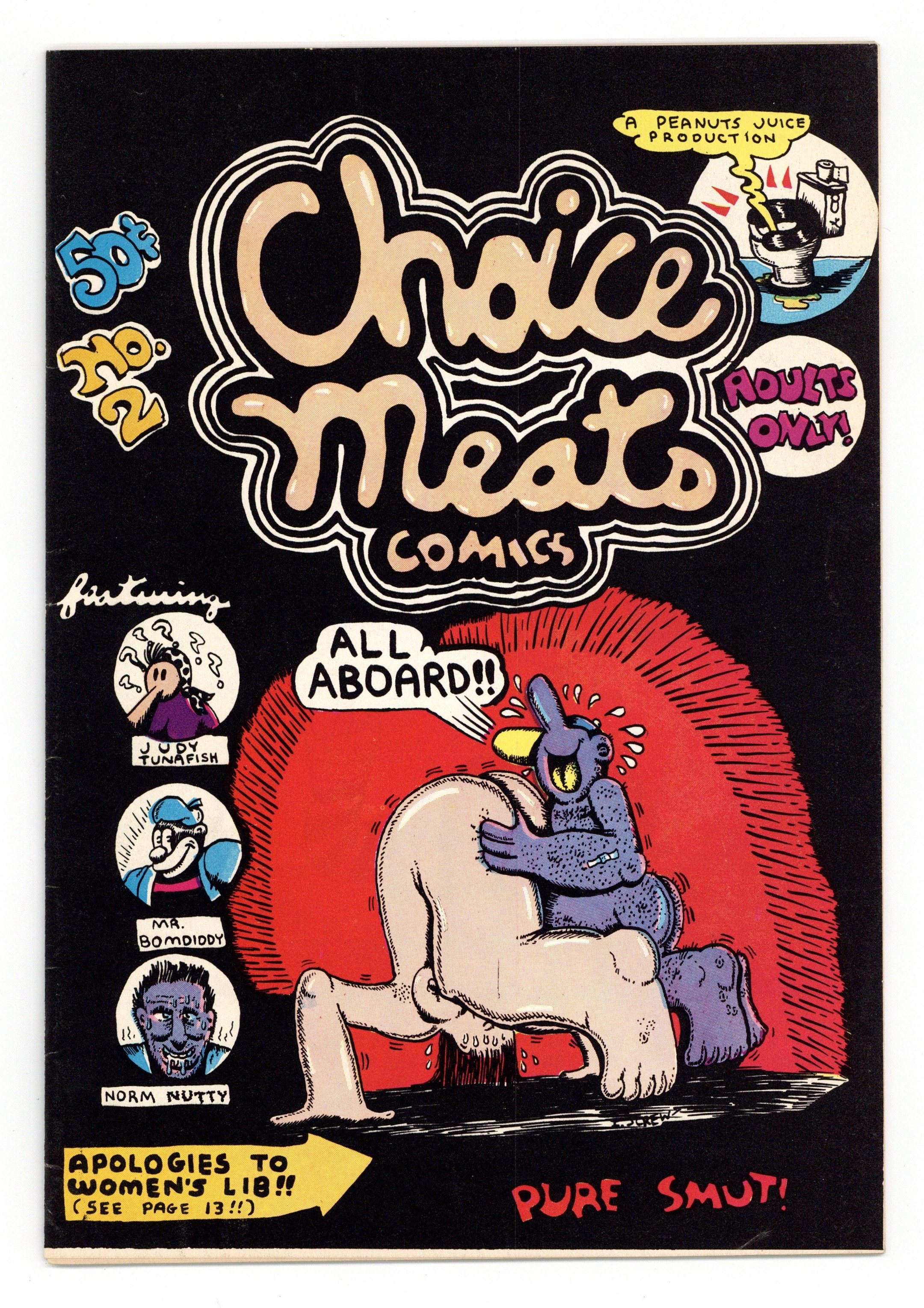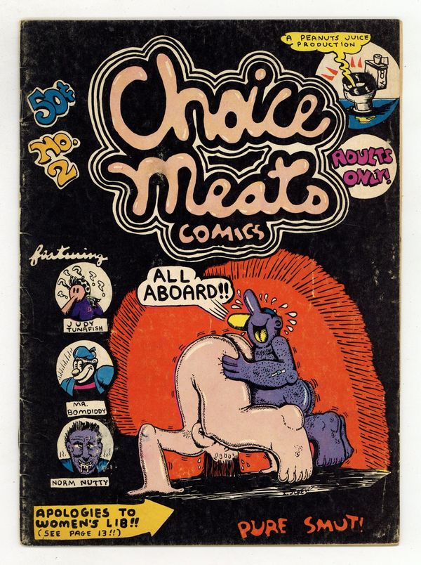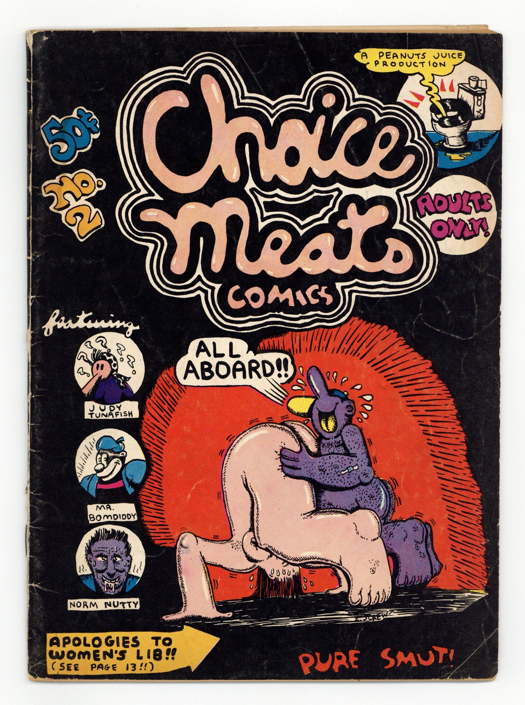 Choice Meats Comics (1971 Peanut Juice Productions/Adam's Apple Distributing) #2, 1st Printing GD 2.0Tags: UndergroundPublished 1971 by Peanut Juice Productions.$20.00- 2" spine split from the bottom.