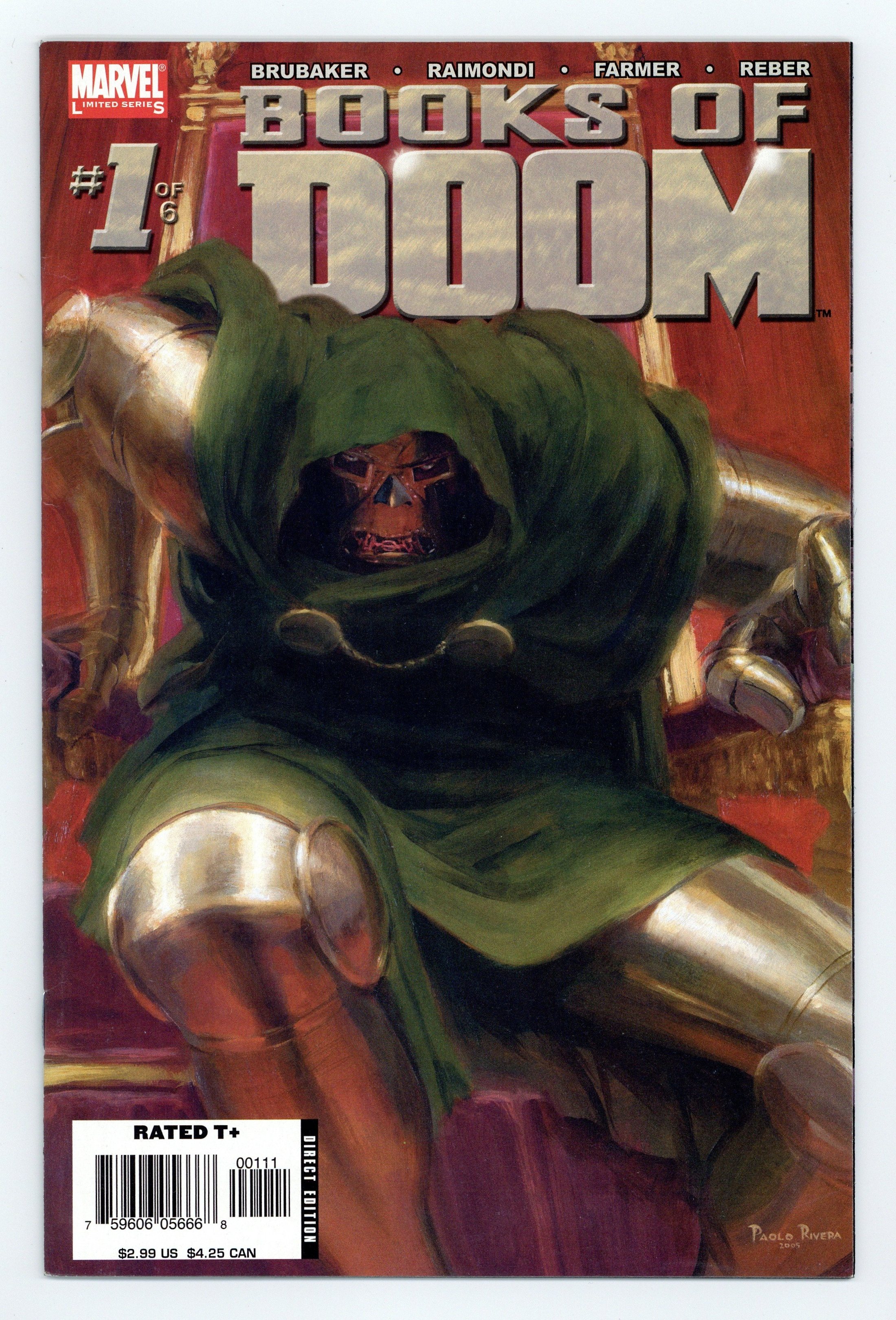 Written by ED BRUBAKER Penciled by PABLO RAIMONDI Cover by PAOLO RIVERA. Five-time Eisner-Nominated Best Writer Ed Brubaker turns his shadowy vision to Marvel's greatest villain, Victor Von Doom. With the phenomenal art team of Pablo Raimondi and Mark Farmer, you will witness Doom's life from his earliest moments to the day he took the throne of Latveria. A dark and revealing examination of how an innocent boy grows up to be a tyrant, a new twist on an old legend -- the Books of Doom is a sweeping epic of tragedy, madness, and destiny, and unlike any other Marvel Comic you will buy this year! In this debut issue, turning his back on childhood love, young Victor develops an obsession with the dark arts that stole his beautiful mother from him. But it's his experiments with science that attract the interest of global powers and bring his Gypsy tribe into direct conflict with the despotic rulers of Latveria. Cover price $2.99.