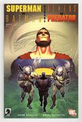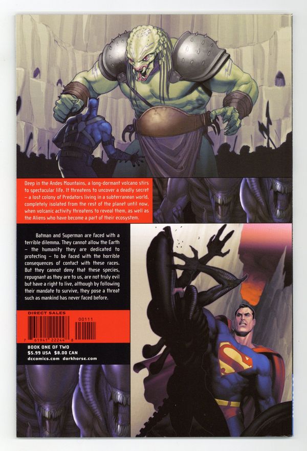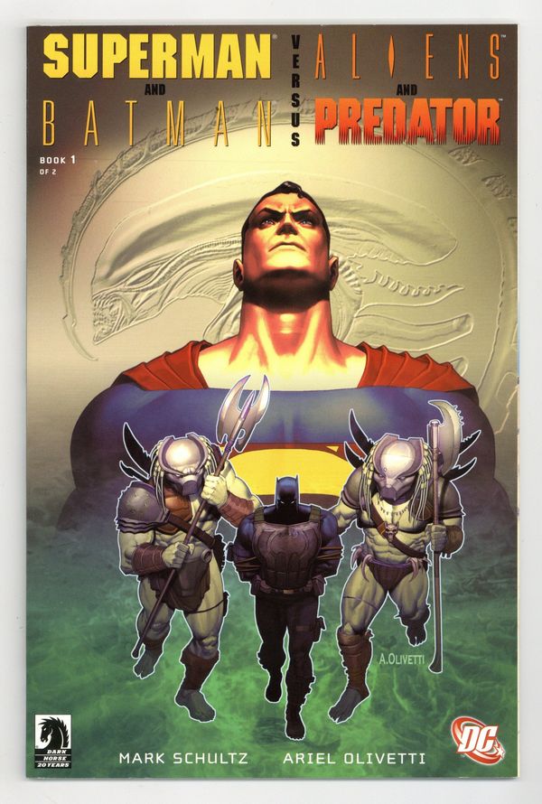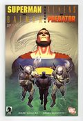 Written by Mark Schultz. Art and cover by Ariel Olivetti. It's the battle you've been waiting for in a thrilling 2-issue miniseries by Mark Schultz (Cadillacs & Dinosaurs) with computer-generated painted art by Ariel Olivetti (SPACE GHOST)! They're back! The relentless killing machines known as Aliens and the unstoppable race of hunters called Predators have returned to Earth. But saying 'they're back' isn't quite accurate - Batman discovers that the two races, sealed away from the human population, have been here all along! Can he and Superman get them off our world before they threaten the planet's existence? Co-published with Dark Horse Comics. Prestige Format ? 48 pg (no ads), FC Edited by Joey Cavalieri Cover price $5.99.